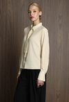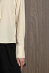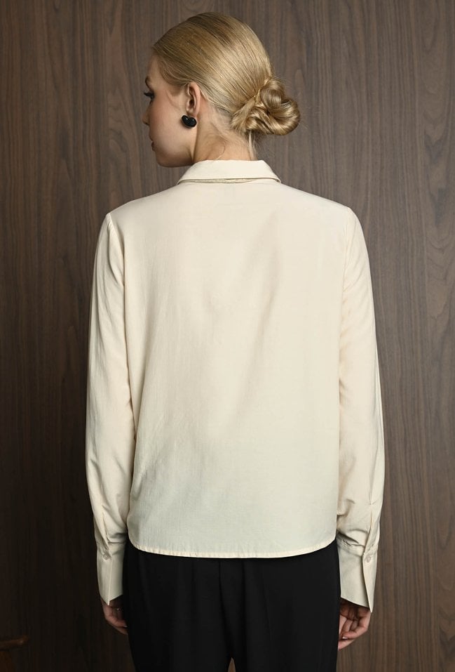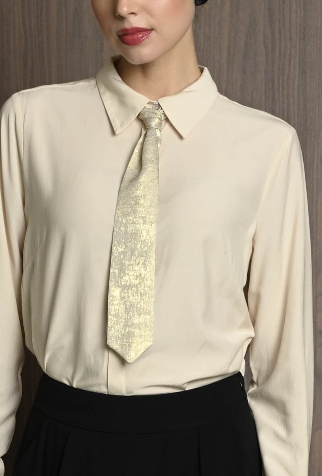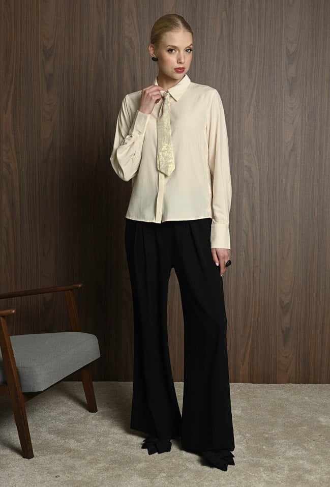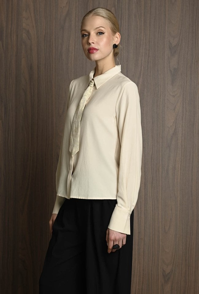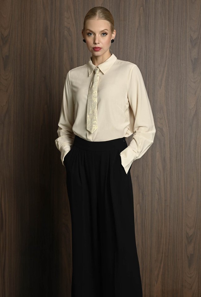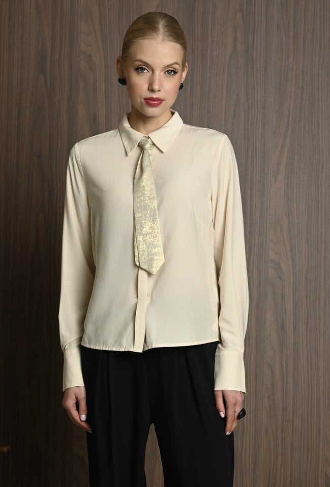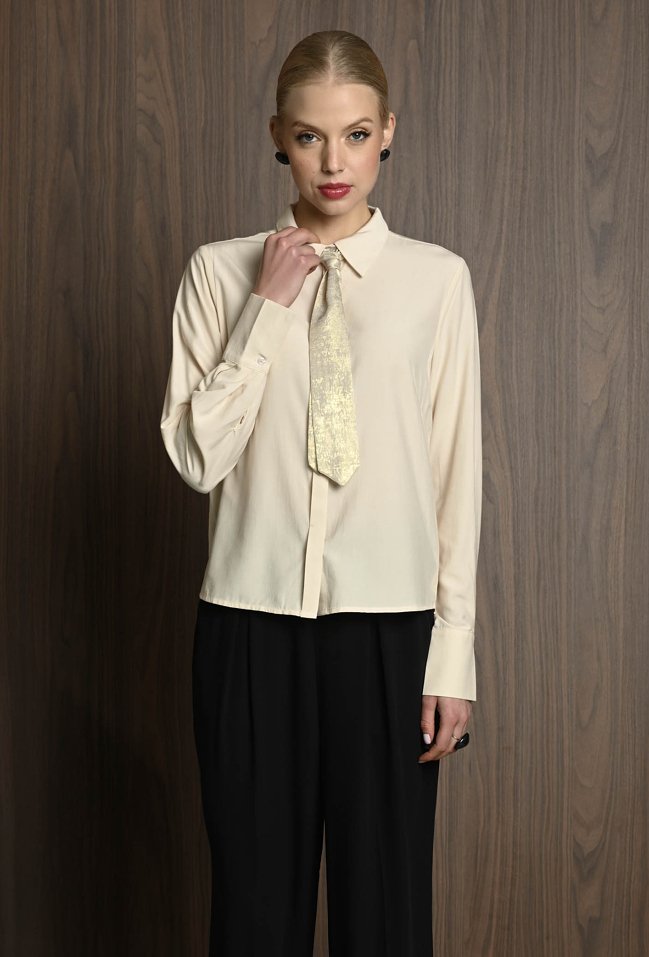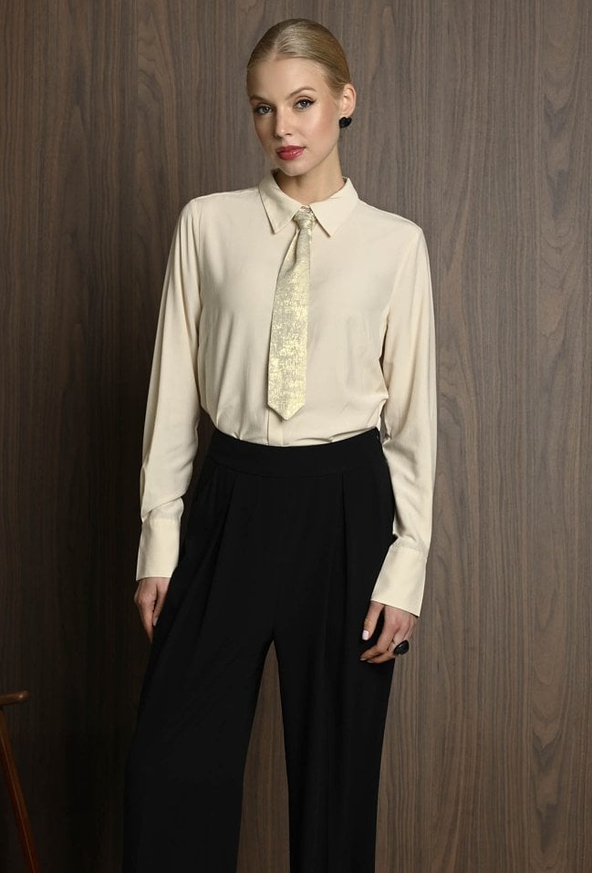 Koszula damska w neutralnym kolorze, z szerokimi mankietami zapinanymi na guziki. Uwagę przyciąga krawat ozdobny, który dodaje całości eleganckiego i nieco błyszczącego akcentu. Koszula świetnie sprawdzi się jako baza stylizacji – ma klasyczny fason, ale dzięki połyskującemu detalowi staje się wyjątkowa. Można ją nosić zarówno do prostych spodni, jak i spódnicy, tworząc stylowy, ale stonowany look z nutą oryginalności. Modelka na zdjęciu ma 177 cm wzrostu i prezentuje rozmiar 36.