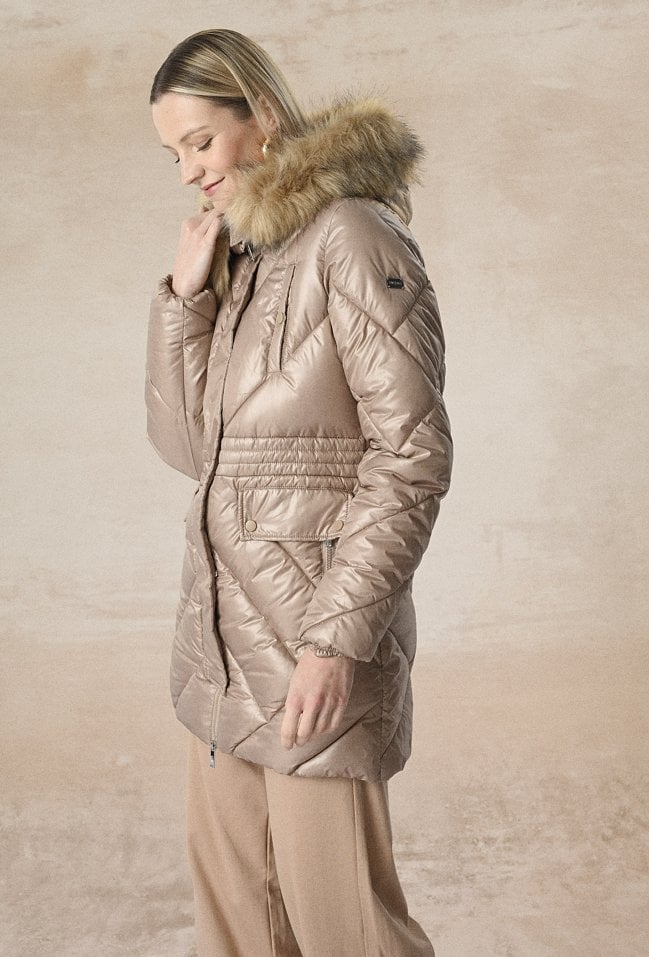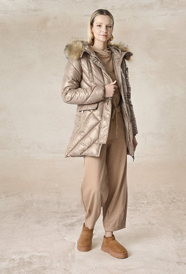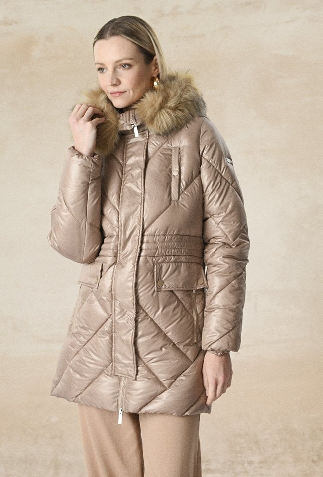 Beżowa pikowana kurtka to bardzo dobry wybór na jesienne i zimowe chłody. To niezwykle wygodny i kobiecy krój. Kurka zapinana jest na zamek i zatrzaski. Ma smukły kaptur z futerkiem, który rozłożycie układa się na kurtce, dwie boczne kieszenie. Modelka na zdjęciu ma 175 cm wzrostu i prezentuje rozmiar 36.