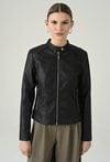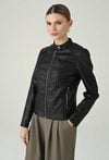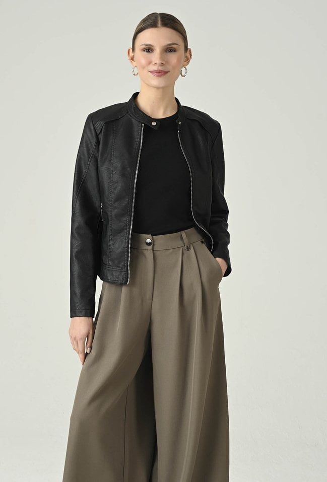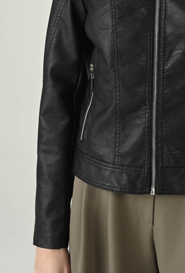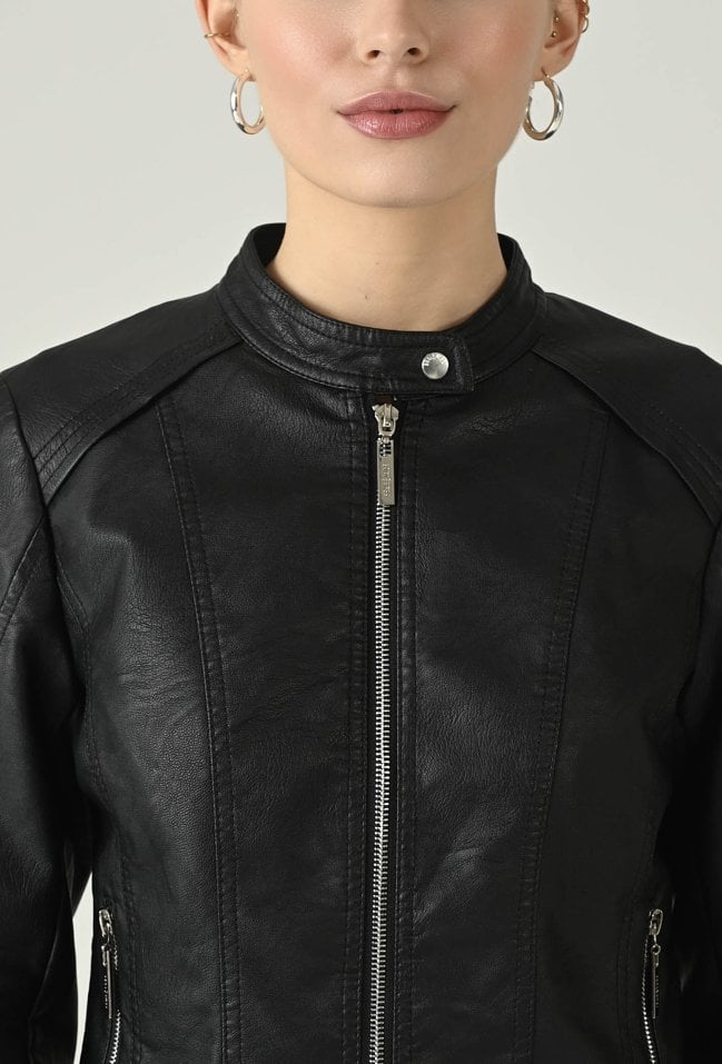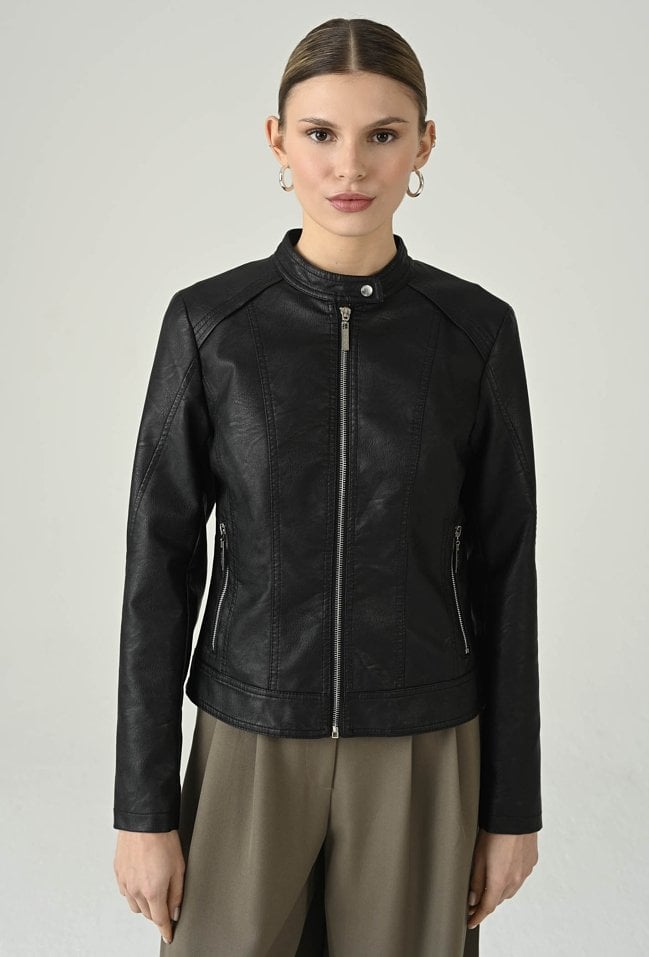Czarna kurtka wykonana z imitacji skóry. Posiada delikatnie taliowany krój, zapinana na zamek, w środku podszyta gładkim materiałem. Stójka z patką zapinaną na guzik, kieszenie zapinane na zamki. Ten model świetni uzupełni wiosenne stylizacje. Modelka na zdjęciu ma 177 cm wzrostu i prezentuje rozmiar 36/S.