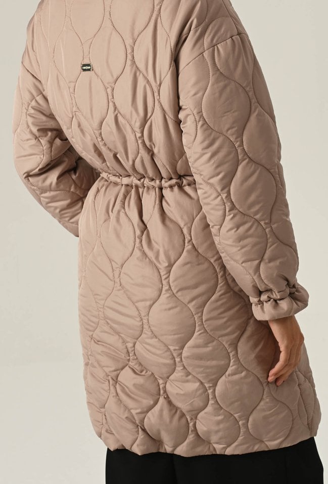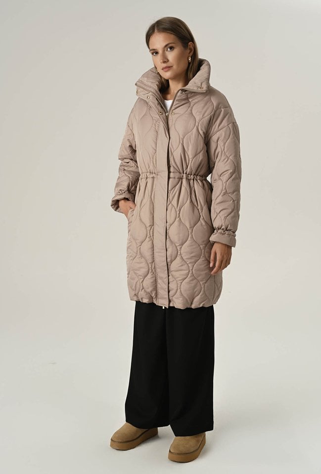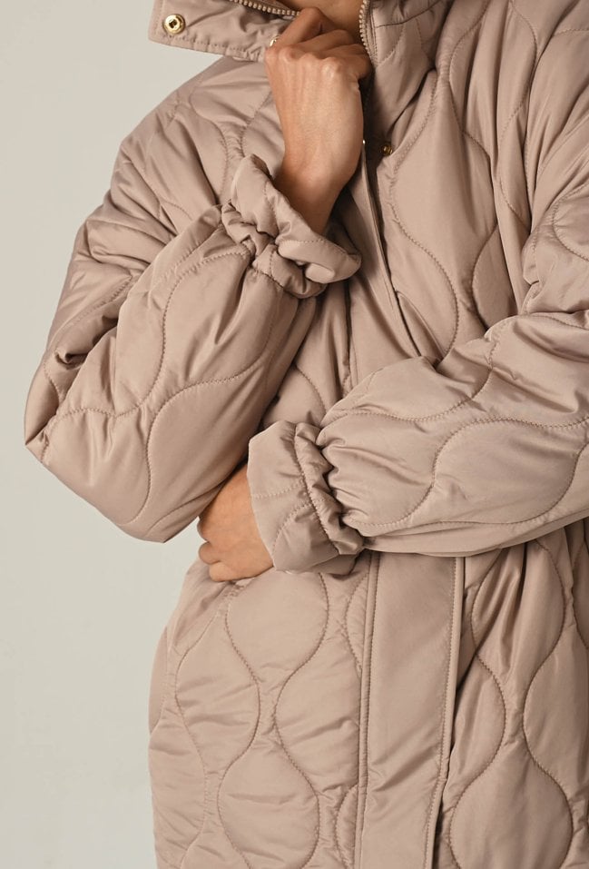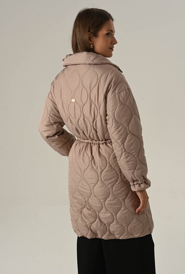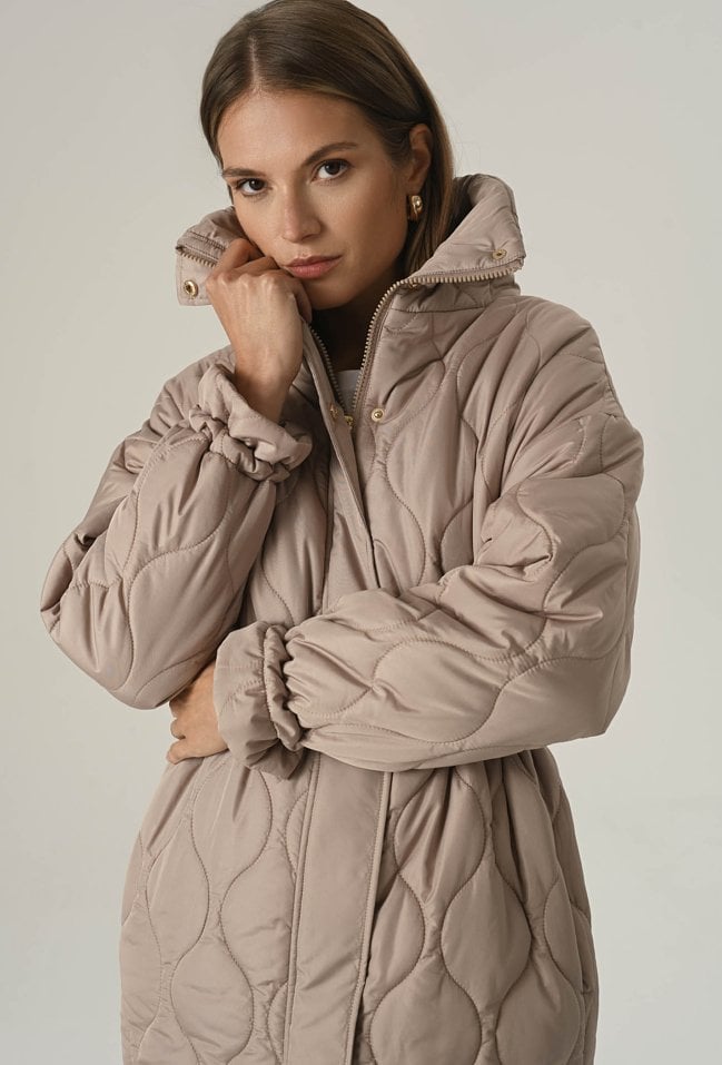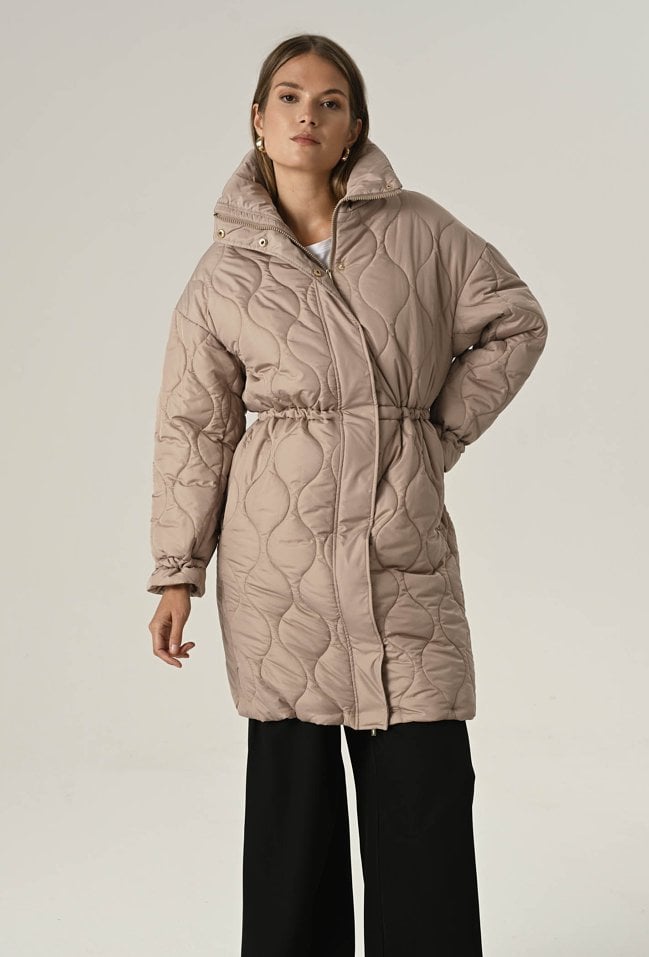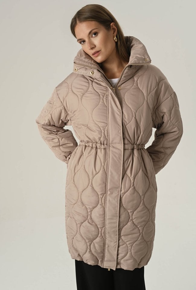 Lekka, długa kurtka idealna na jesienne dni. Modne, ozdobne pikowanie i stójka nadają jej nowoczesny charakter, a ukryty ściągacz w talii pozwala dopasować fason – możesz podkreślić sylwetkę lub postawić na luźniejszy, oversize’owy look. Praktyczne kieszenie, wygodne zapięcie na zamek i podszewka zapewniają komfort noszenia. Must-have na chłodniejsze dni sezonu przejściowego! Modelka na zdjęciu ma 177 cm wzrostu i prezentuje rozmiar 36/S.