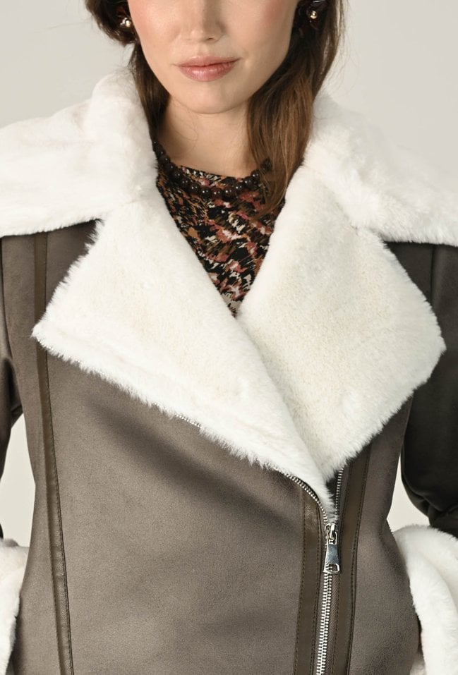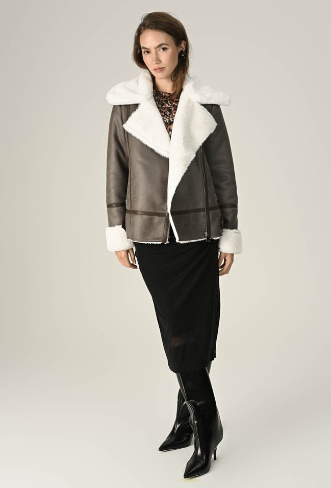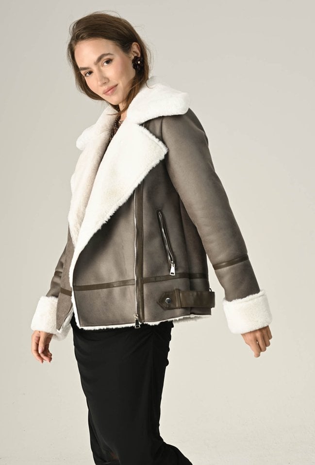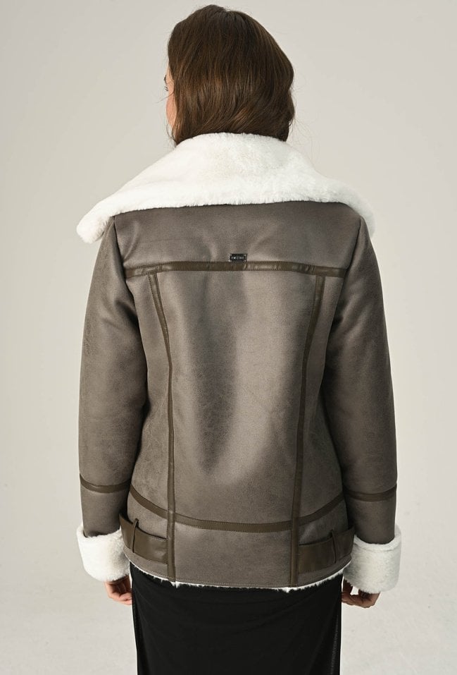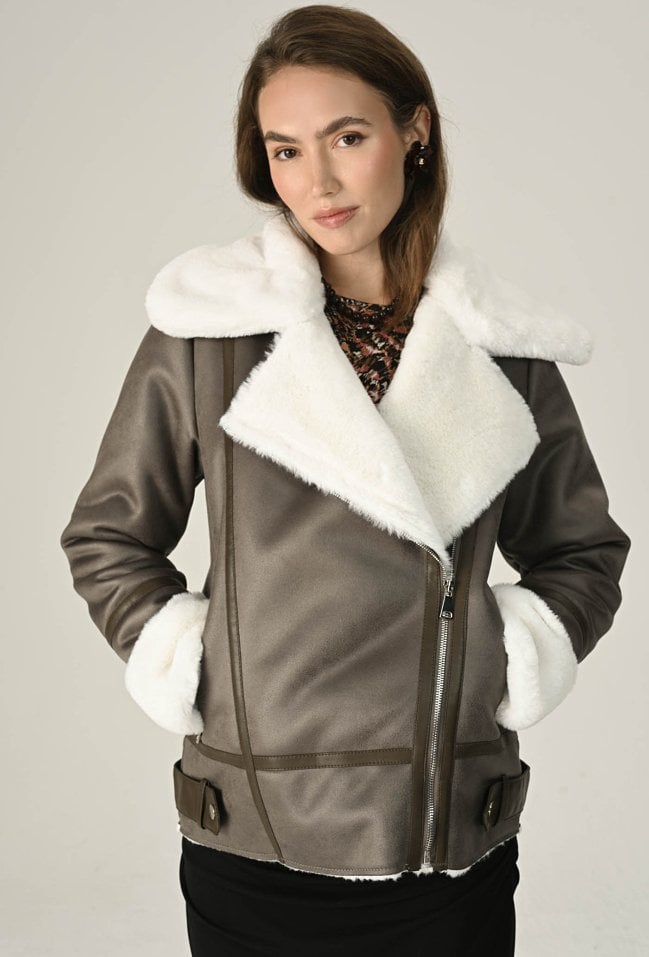 Stylowy kożuch, który łączy modny wygląd z maksymalnym komfortem! Miękkie, przyjemne dla skóry futerko od środka otuli Cię w chłodne dni, a futrzany kołnierz i mankiety dodają elegancji. Nowoczesne przeszycia nadają charakteru, a wsuwane kieszenie zapinane na zamek są praktycznym dodatkiem. Całość dopełnia solidne zapięcie na zamek. Idealny wybór na zimowe spacery i miejskie stylizacje! Modelka na zdjęciu ma 173 cm wzrostu i prezentuje rozmiar 36/S.