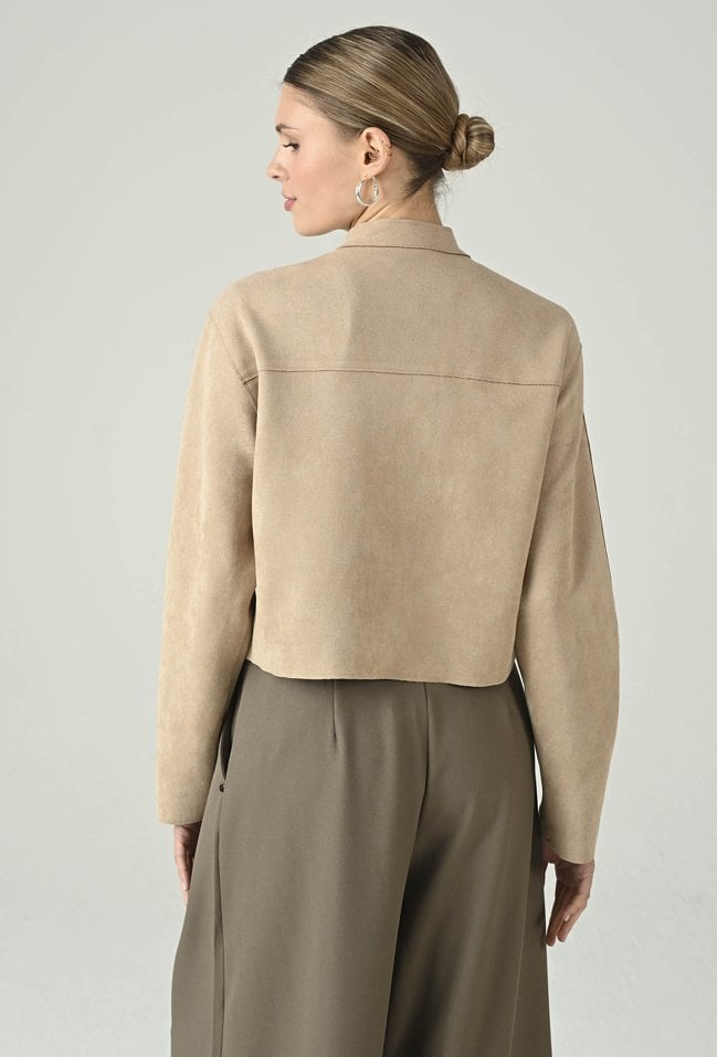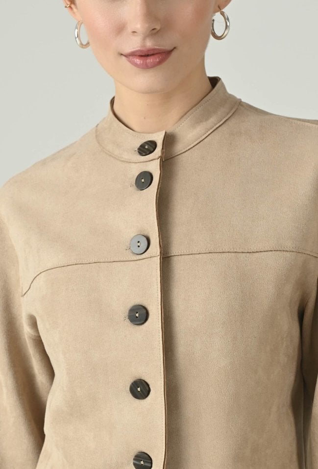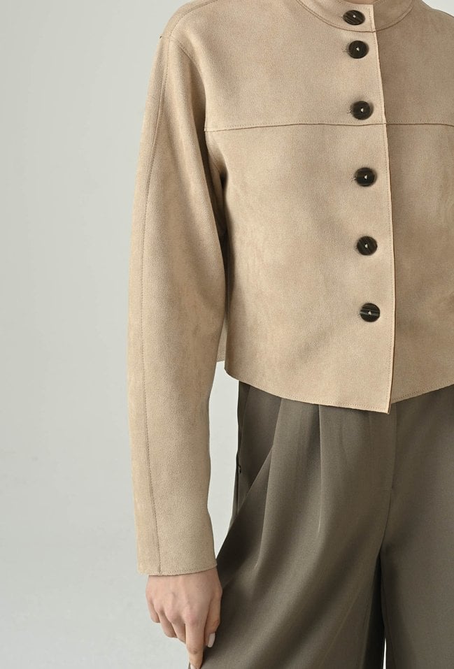 Krótka kurtka w beżowym odcieniu, która łączy minimalistyczną formę z wyrazistymi detalami. Stójka nadaje całości nowoczesnego charakteru, a ozdobne guziki przyciągają wzrok i podkreślają elegancki styl. Długość do talii świetnie buduje proporcje sylwetki, a proste, długie rękawy i dopracowane przeszycia dodają całości schludnego wykończenia. To uniwersalny model, który sprawdzi się w stylizacjach do pracy i na co dzień — noś go z eleganckimi spodniami, spódnicą lub jeansami, tworząc dopracowany, kobiecy look.