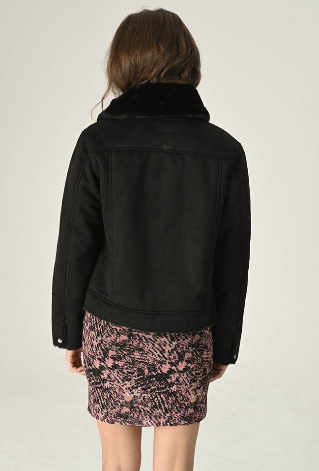 Krótki kożuch o nowoczesnym fasonie to idealny wybór na chłodniejsze dni. Miękkie, przyjemne w dotyku futerko od wewnątrz zapewnia komfort i ciepło, a futrzany kołnierz dodaje elegancji. Model zapinany na suwak, wyposażony w praktyczne, wsuwane kieszenie z bezpiecznym zapięciem – doskonały na co dzień i do miejskich stylizacji. Modelka na zdjęciu ma 174 cm wzrostu i prezentuje rozmiar 36.