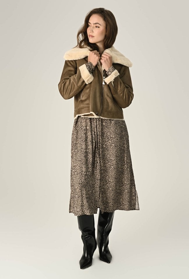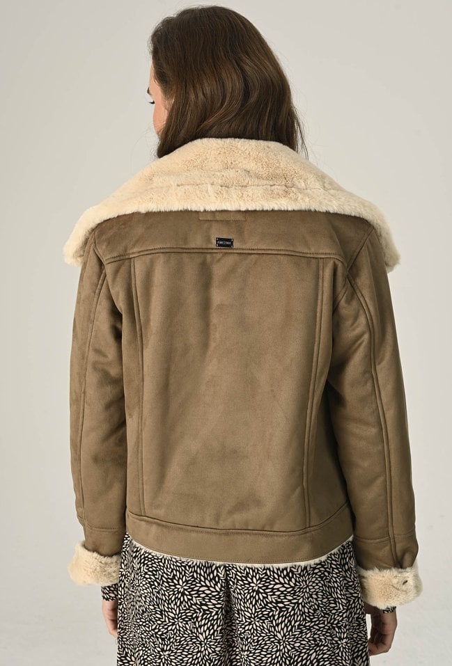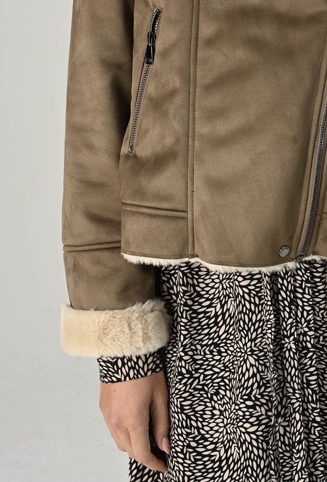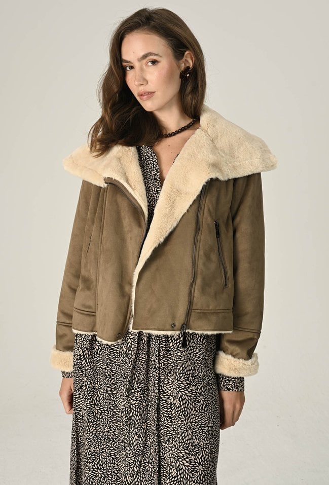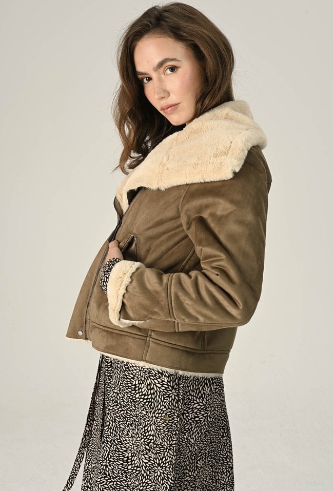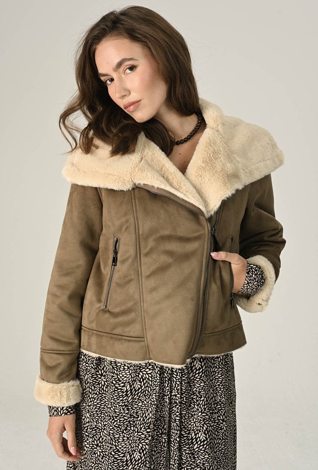 Krótki kożuch o nowoczesnym fasonie to idealny wybór na chłodniejsze dni. Miękkie, przyjemne w dotyku futerko od wewnątrz zapewnia komfort i ciepło, a futrzany kołnierz dodaje elegancji. Model zapinany na suwak, wyposażony w praktyczne, wsuwane kieszenie z bezpiecznym zapięciem – doskonały na co dzień i do miejskich stylizacji. Modelka na zdjęciu ma 174 cm wzrostu i prezentuje rozmiar 36.