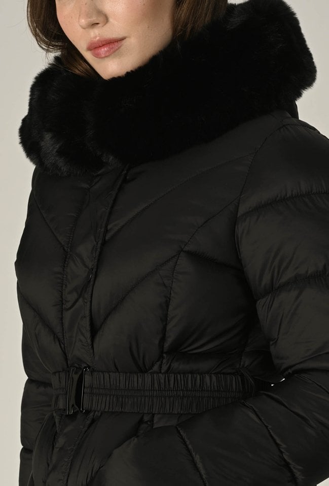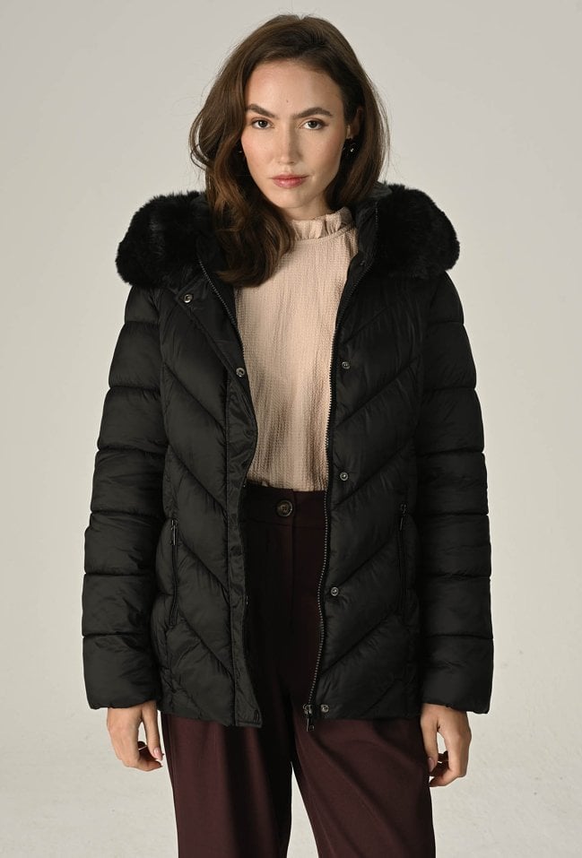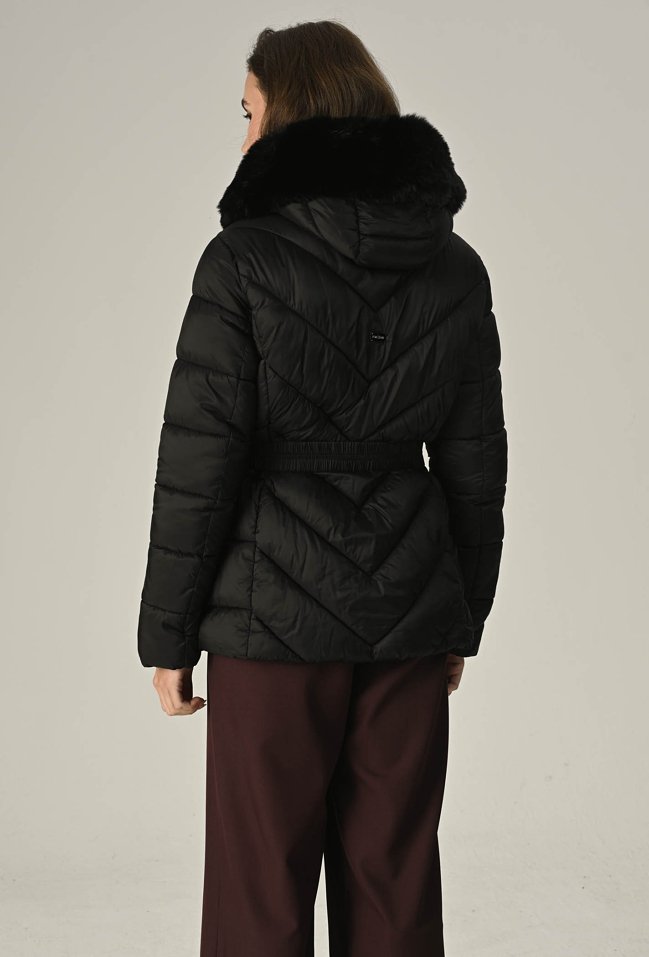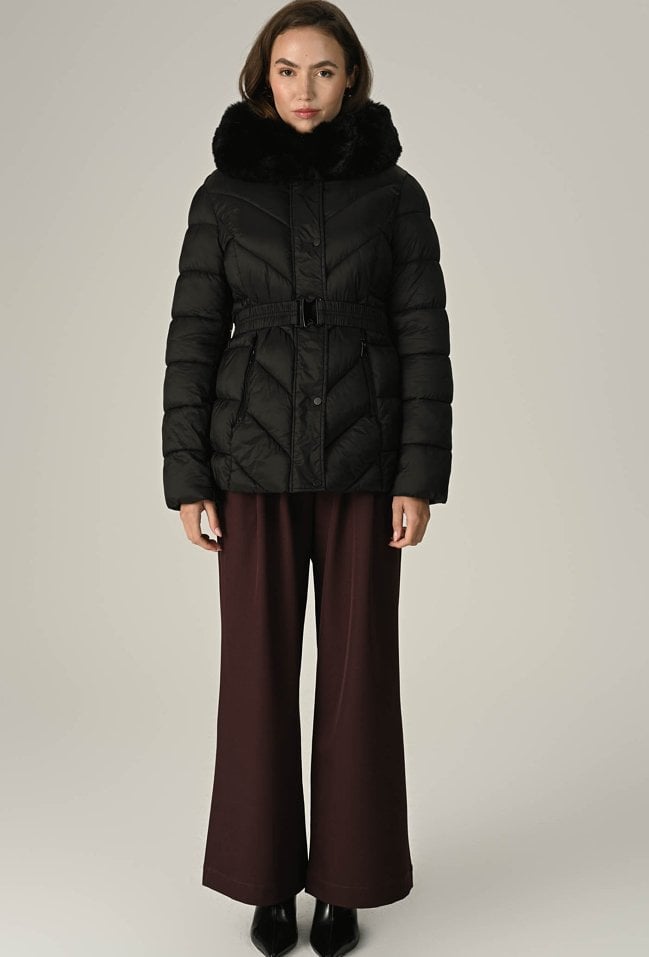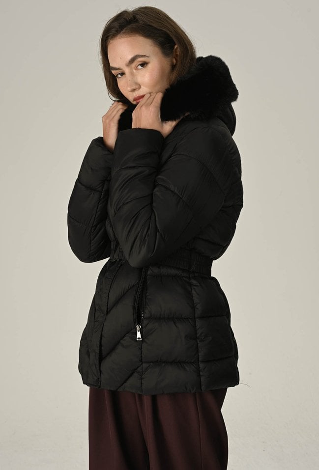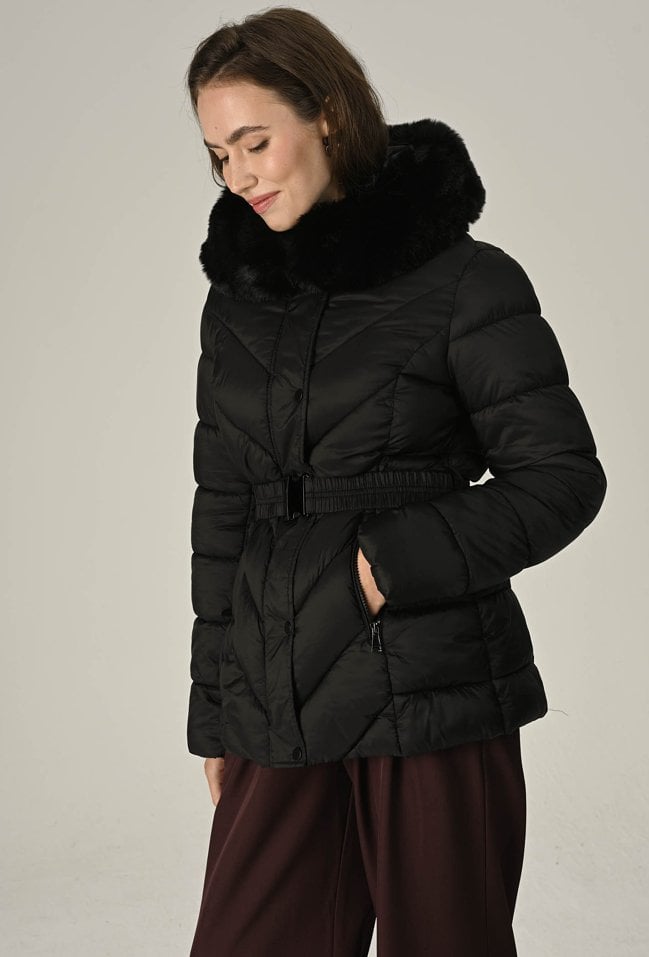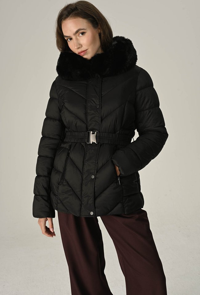 Stylowa kurtka z ociepleniem w odcieniu klasycznej czerni to połączenie nowoczesnego designu i funkcjonalności. Pikowany fason z wyraźnym taliowaniem i paskiem pięknie podkreśla sylwetkę, a miękki kaptur obszyty futerkiem dodaje całości luksusowego charakteru. Zapięcie na suwak i napy zapewnia wygodę, a kieszenie z zamkami to praktyczny akcent na co dzień. Idealna propozycja na chłodne dni – ciepła, kobieca i wyjątkowo elegancka. Modelka na zdjęciu ma 173 cm wzrostu i prezentuje rozmiar 36.