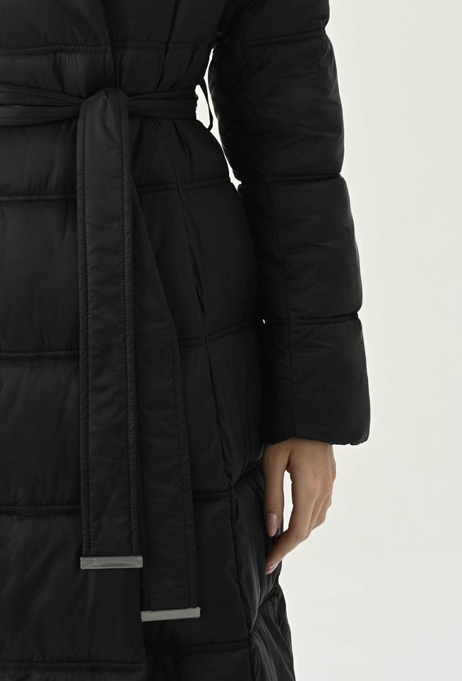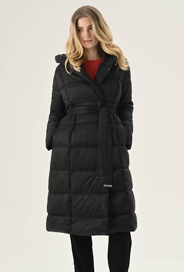 Elegancki płaszcz damski w czarnym klasycznym kolorze. To bardzo fajna propozycja na chłodne dni. Ma ponadczasowy, szlafrokowy fason z podkreślającym sylwetkę wiązaniem w talii, duży kaptur, który osłoni nas przed chłodem oraz praktyczną długość, idealną do spódnic i spodni. Został wykonany z pikowanego materiału z ciepłym wypełnieniem, dzięki czemu sprawdzi się doskonale jako okrycie wierzchnie w sezonie jesienno-zimowym. Modelka na zdjęciu ma 177 cm wzrostu i prezentuje rozmiar 36.