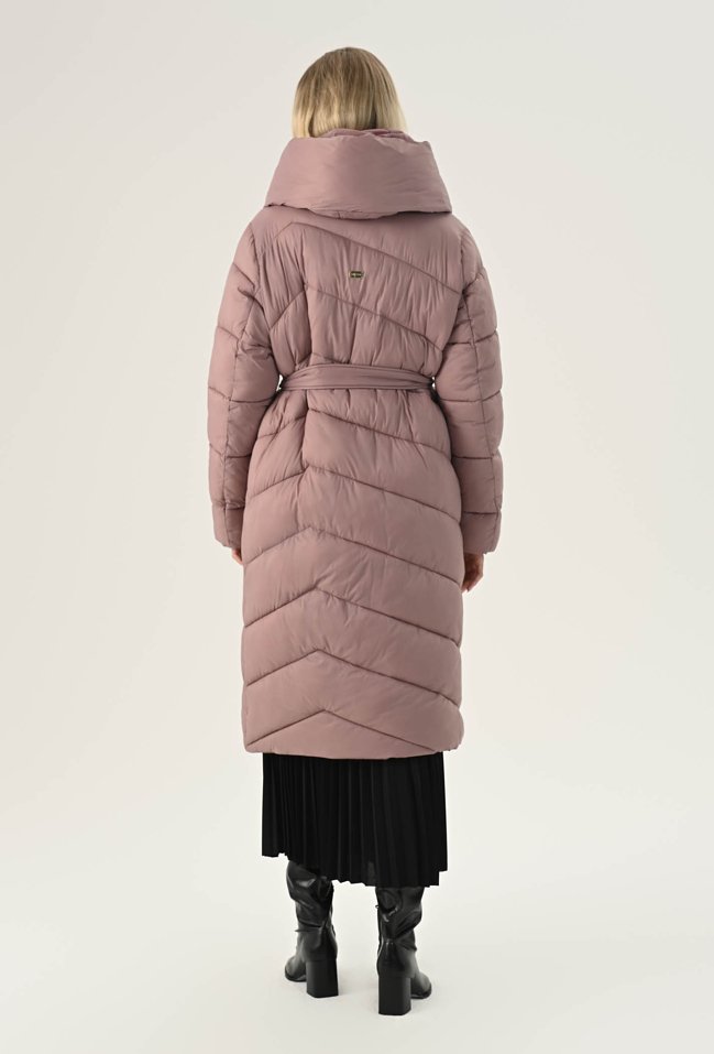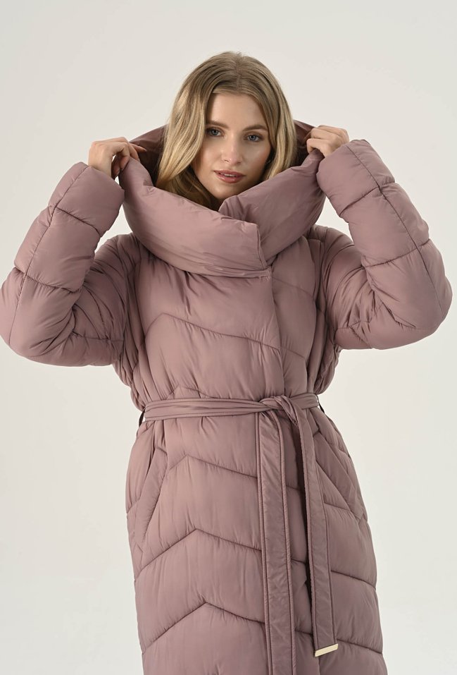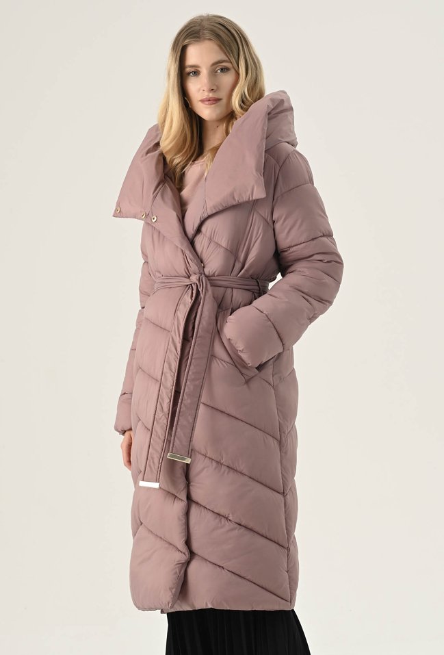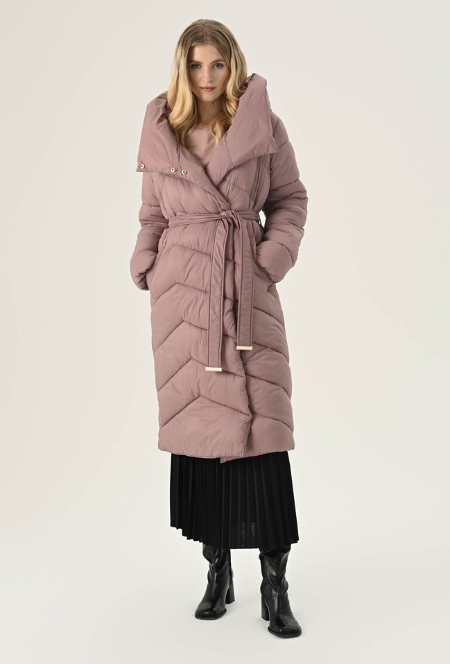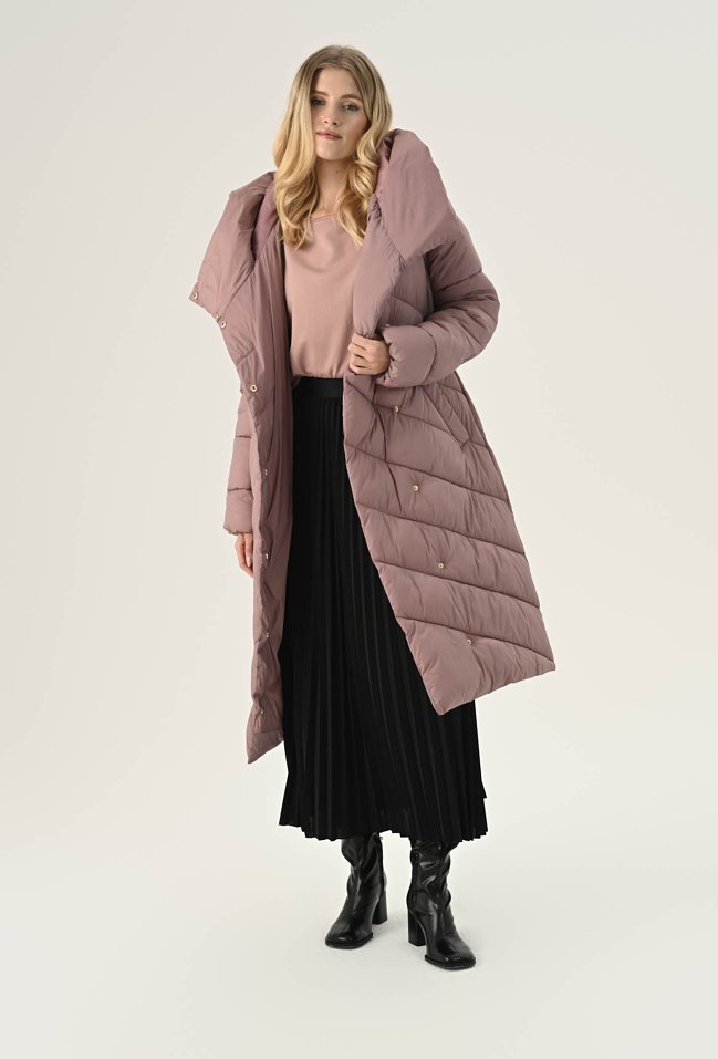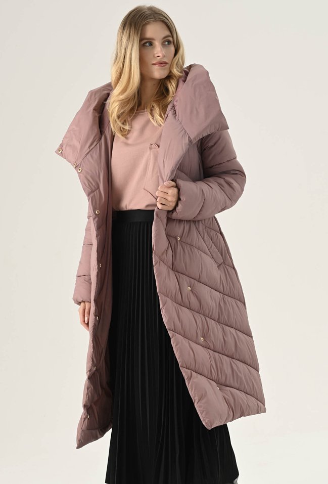 Elegancki płaszcz w pięknym zgaszonym różu. To bardzo ciekawa propozycja na chłodne dni. Ma ponadczasowy, szlafrokowy fason z podkreślającym sylwetkę wiązaniem w talii, duży kołnierz, który osłoni nas przed chłodem oraz praktyczną długość, idealną do spódnic i spodni. Został wykonany z pikowanego materiału z ciepłym wypełnieniem, dzięki czemu sprawdzi się doskonale jako okrycie wierzchnie w sezonie jesienno-zimowym. Modelka na zdjęciu ma 177 cm wzrostu i prezentuje rozmiar 36.