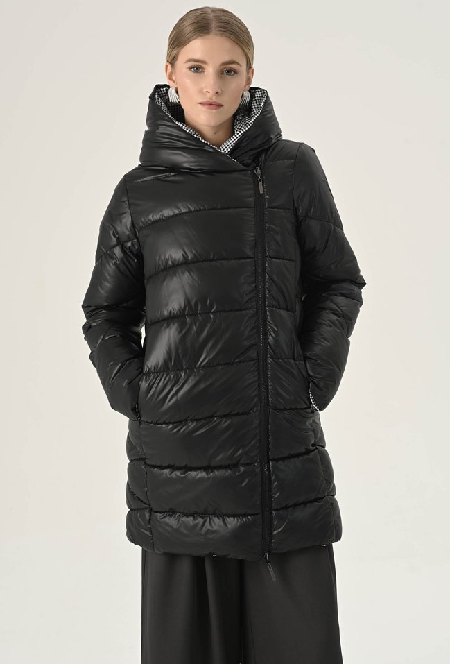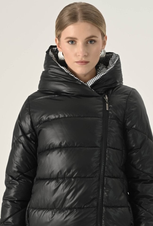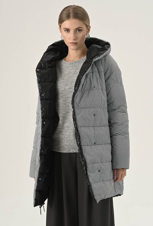 Dłuższa kurtka z pikowaniem oraz kapturem. Kurtkę można nosić dwustronnie jako czarną lub w pepitkę . Posiada długie rękawami i wpuszczane kieszenie, Czarna strona na froncie kurtki zapinana jest na suwak natomiast strona w peitkę na froncie ma zatrzaski a suwak w środku. Model ten z pewnością dopełni codzienne, jesienne stylizacje. Modelka na zdjęciu ma 177 cm wzrostu i prezentuje rozmiar 36.