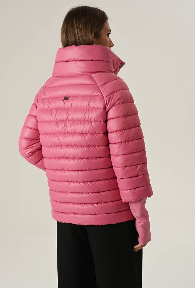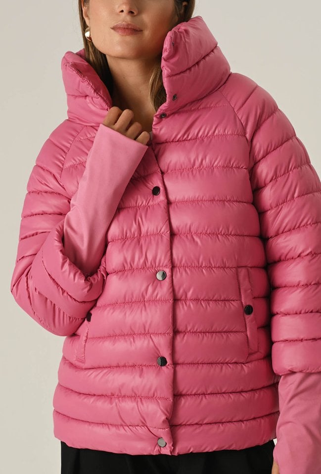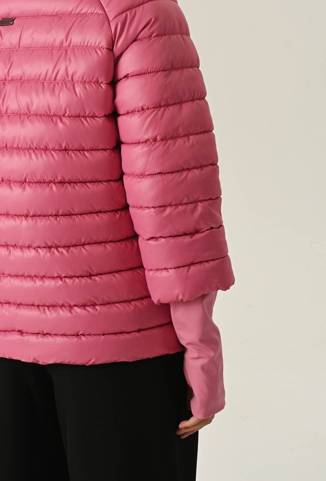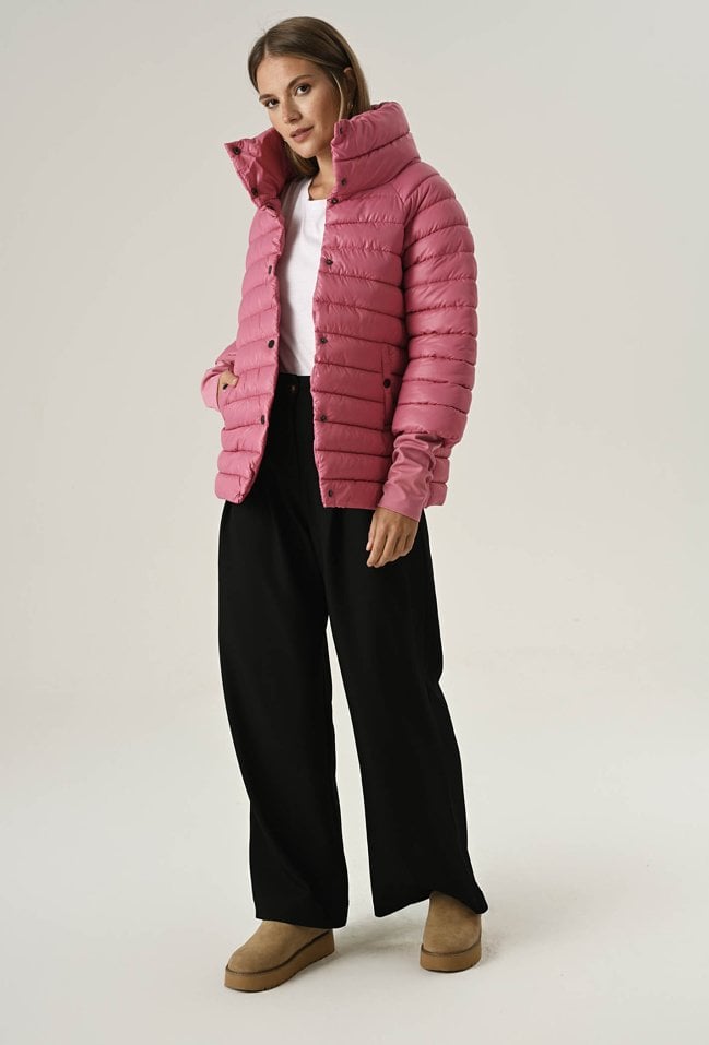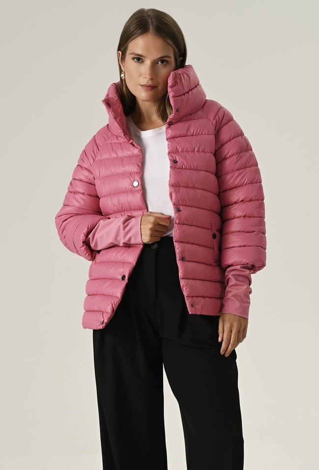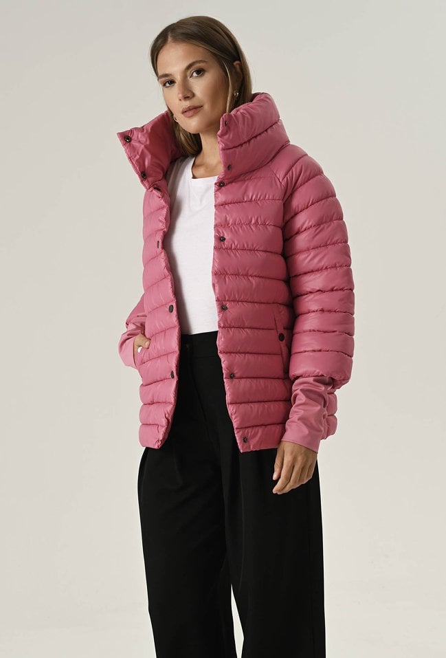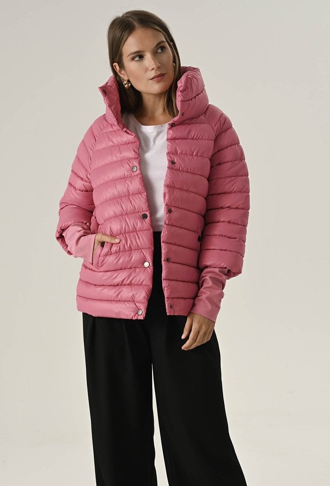 Różowa pikowana kurtka, z wysokim kołnierzem to idealna propozycja na przejściowy sezon. Doskonale sprawdzi się na jesienne wieczory. Zapinana na napy, posiada dwie kieszenie oraz 3/4 rękawy z długimi ścigaczami. Sprawdzi się doskonale w casualowym jak i sportowym stylu. Modelka na zdjęciu ma 177 cm wzrostu i prezentuje rozmiar 36/S.