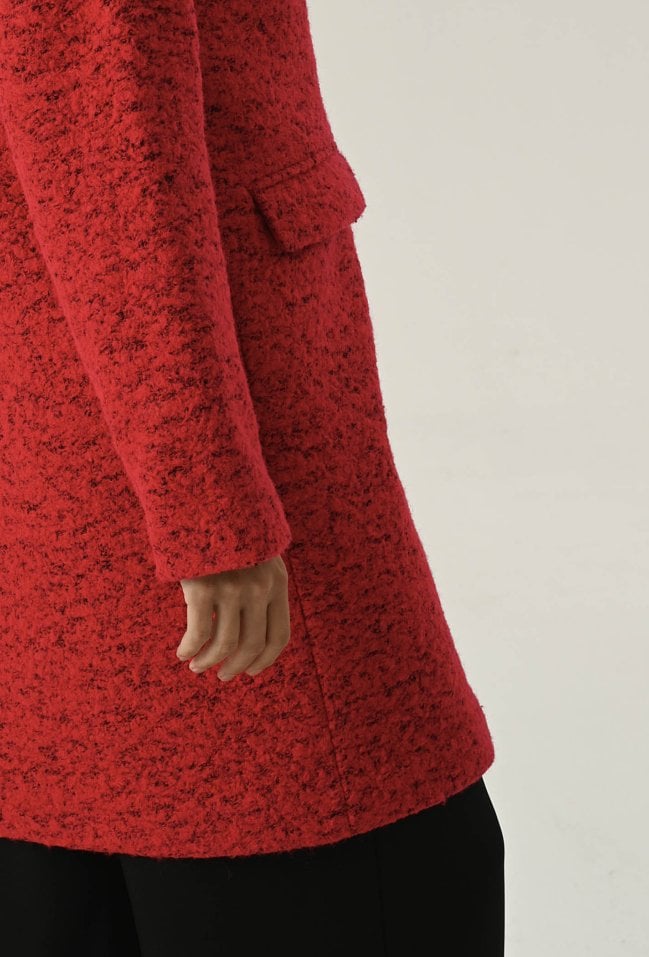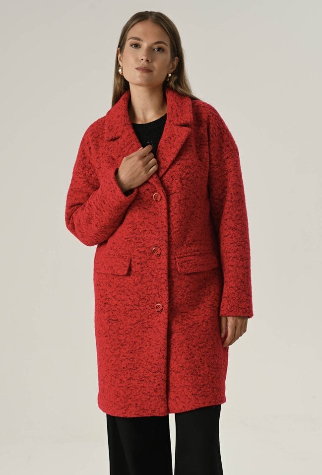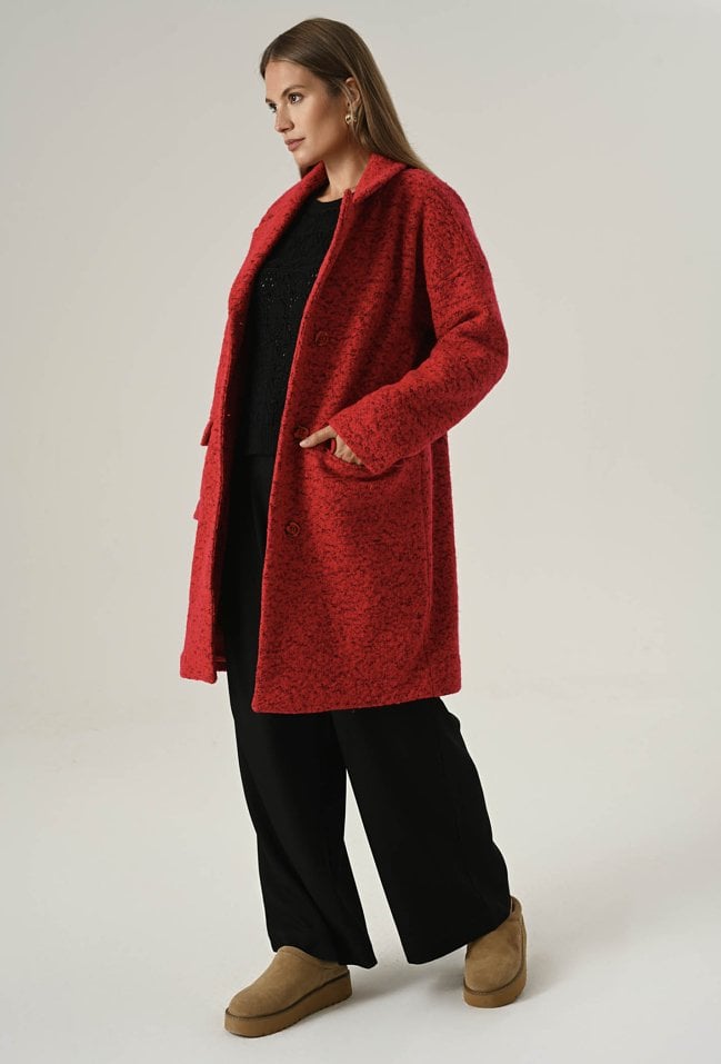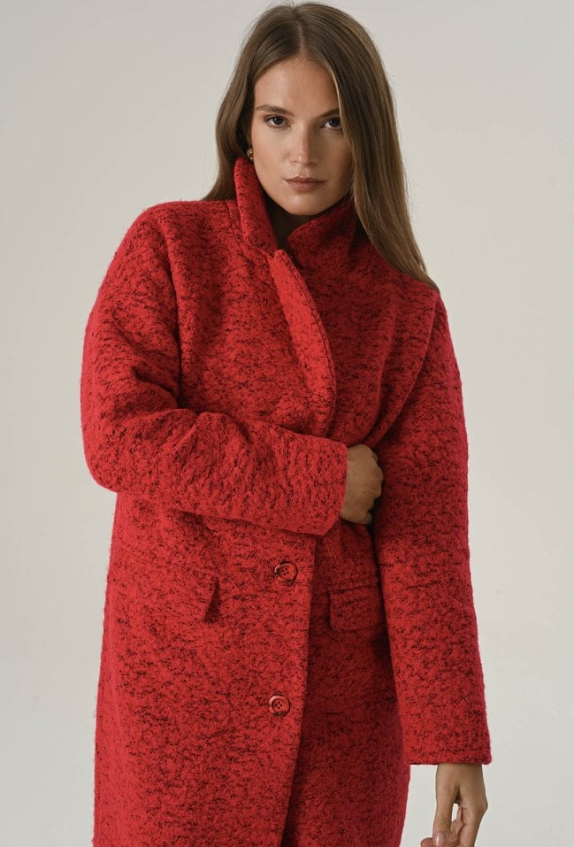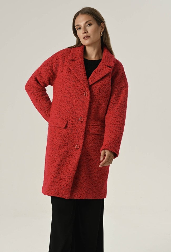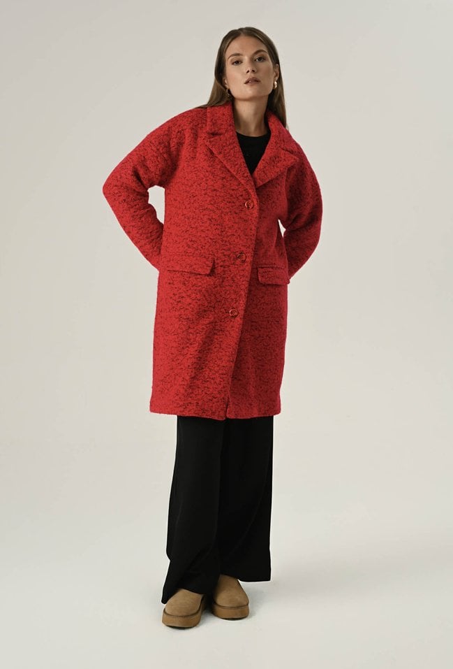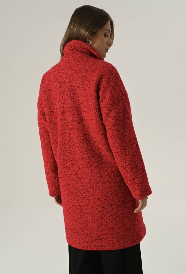 Płaszcz o prostym kroju wykonany z wysokiej jakości dzianiny z domieszką wełny . Długość nad kolano, lekko obniżona linia ramion. Delikatna jodełka nadaje mu charakteru. Model ten idealnie sprawdzi się do każdej stylizacji zarówno tej bardziej casualowej jak i sportowej. Modelka na zdjęciu ma 175 cm wzrostu i prezentuje