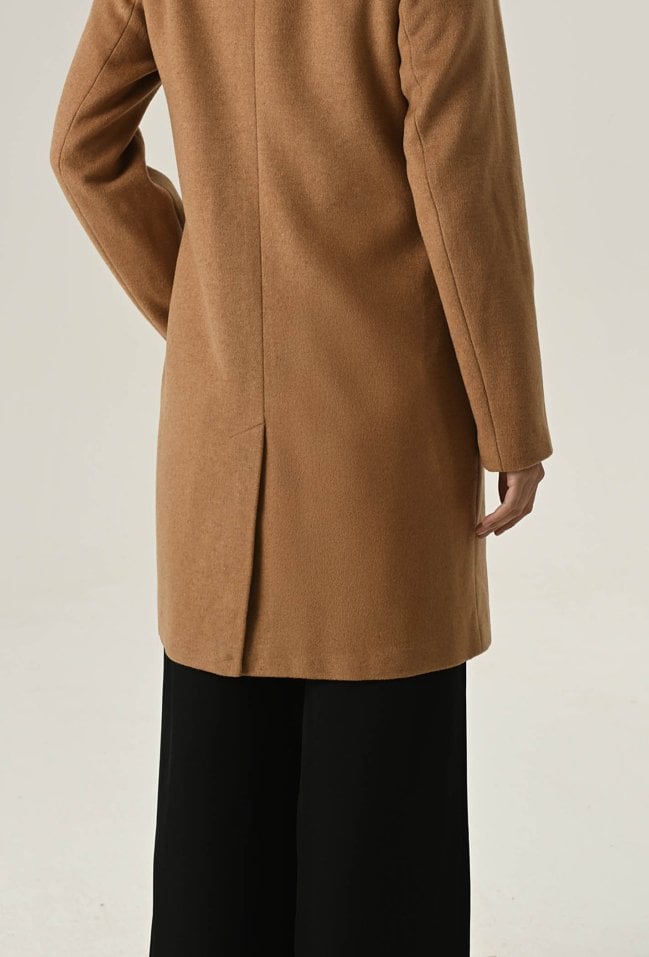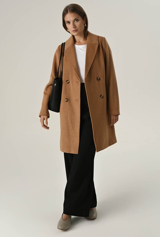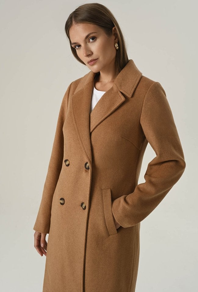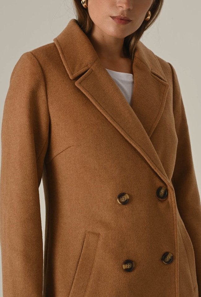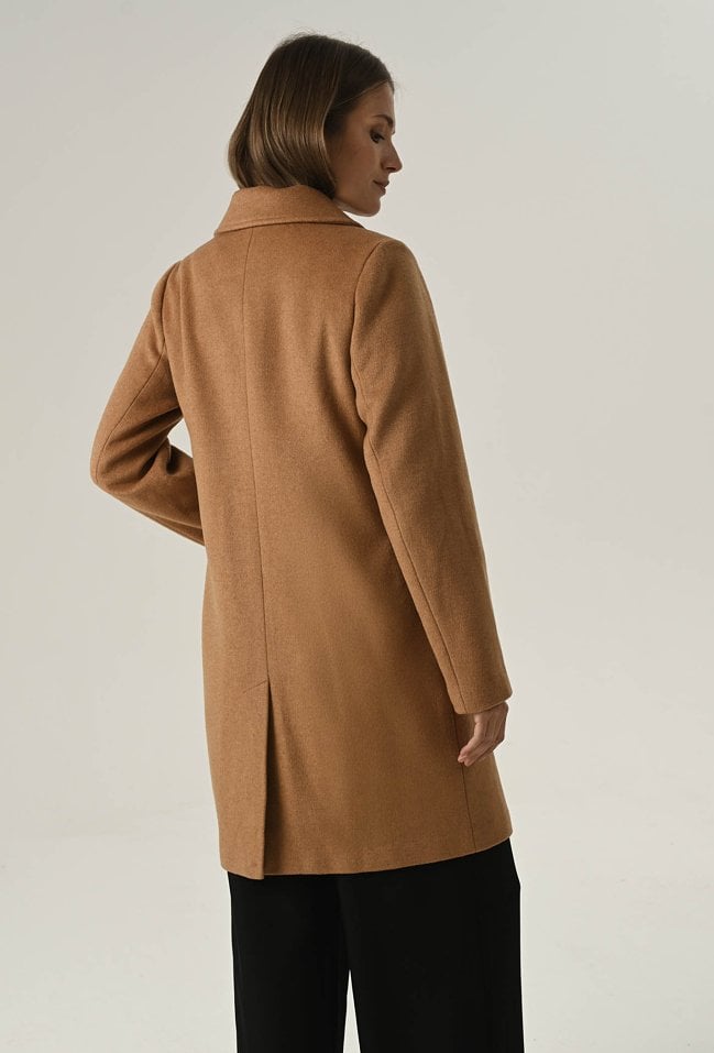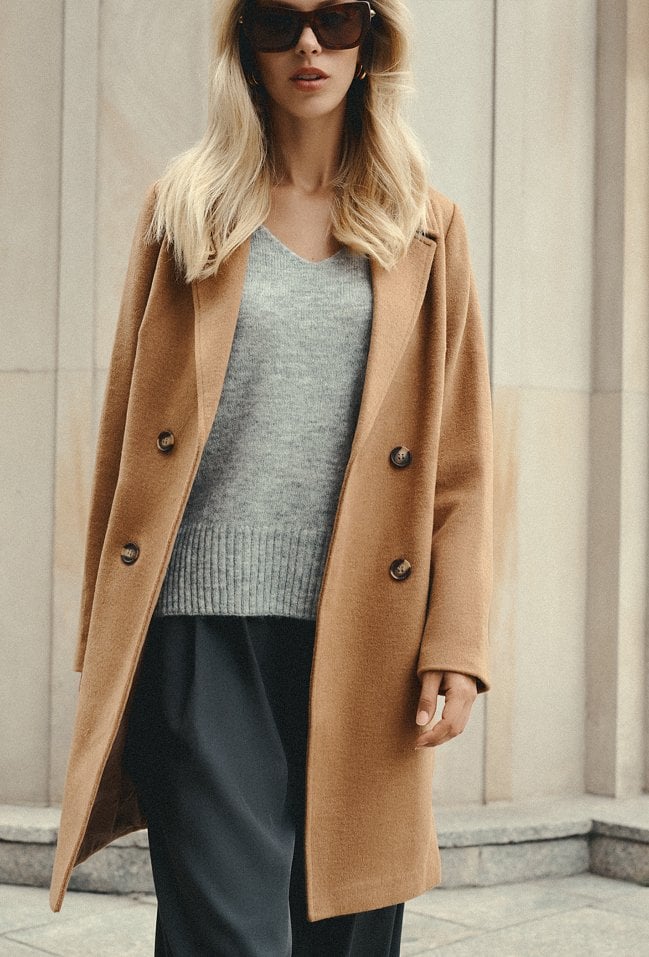 Ponadczasowa elegancja w najlepszym wydaniu. Ten klasyczny, średniej długości płaszcz w pięknym camelowym odcieniu to idealny wybór na chłodniejsze dni. Wykonany z wysokiej jakości dzianiny z dodatkiem wełny, zapewnia ciepło i komfort noszenia. Dwurzędowe zapięcie, szerokie klapy i wsuwane kieszenie podkreślają jego wyrafinowany charakter. Świetnie sprawdzi się zarówno na co dzień, jak i na specjalne okazje.
