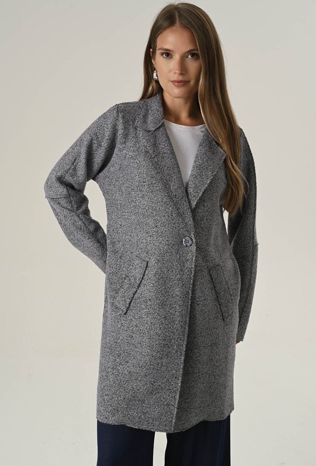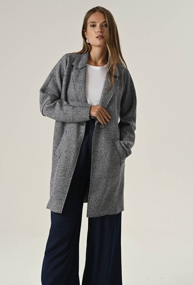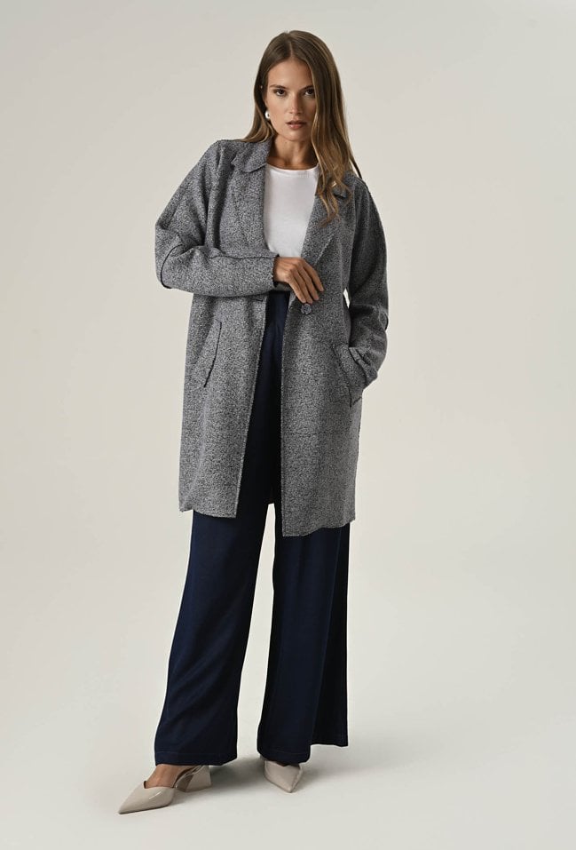 Lekki płaszcz damski o długości midi, wykonany z miękkiej dzianiny z dodatkiem wełny. Bez podszewki, idealny na przejściowe dni. Klasyczny fason zapinany na jeden guzik i praktyczne, wsuwane kieszenie tworzą ponadczasowy model, który dopełni każdą stylizację. Modelka na zdjęciu ma 177 cm wzrostu i prezentuje rozmiar 36/S.