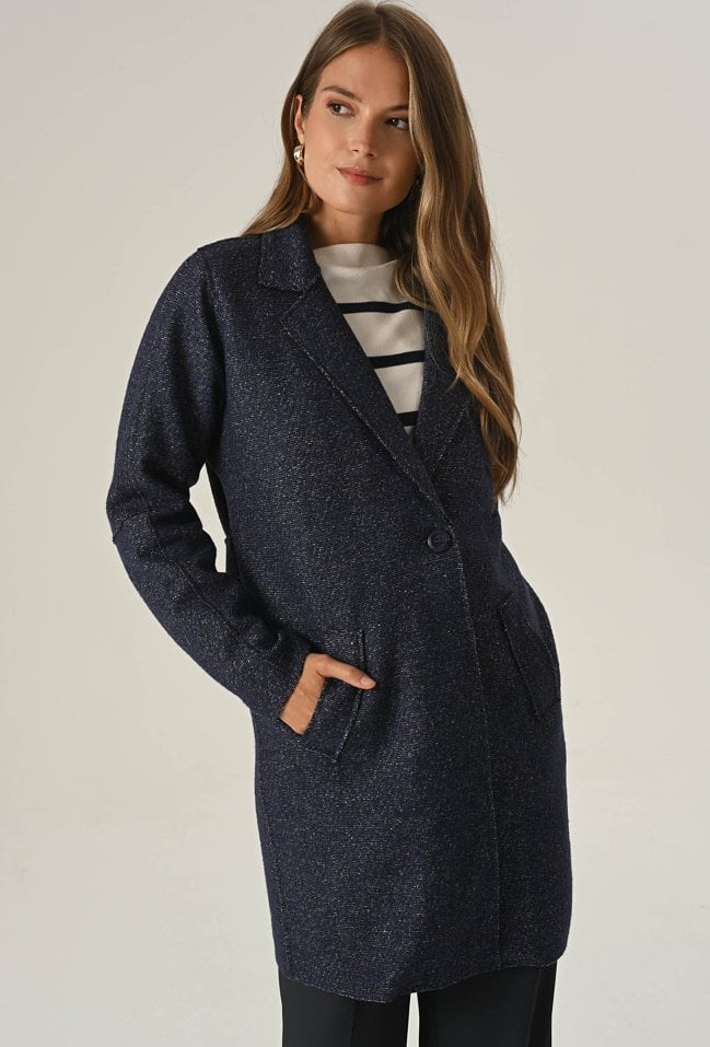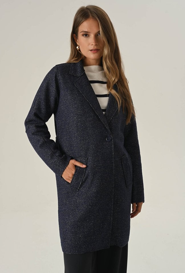 Lekki płaszcz damski o długości midi, wykonany z miękkiej dzianiny z dodatkiem wełny. Bez podszewki, idealny na przejściowe dni. Klasyczny fason zapinany na jeden guzik i praktyczne, wsuwane kieszenie tworzą ponadczasowy model, który dopełni każdą stylizację. Modelka na zdjęciu ma 177 cm wzrostu i prezentuje rozmiar 36/S.