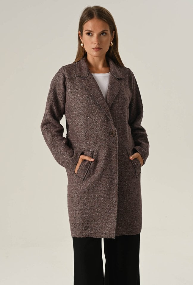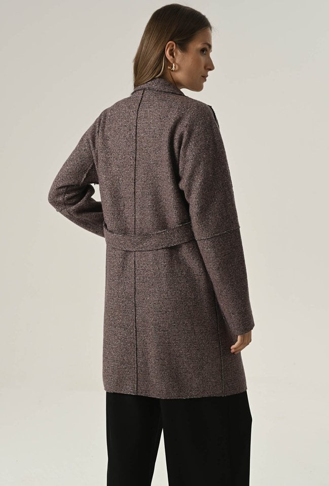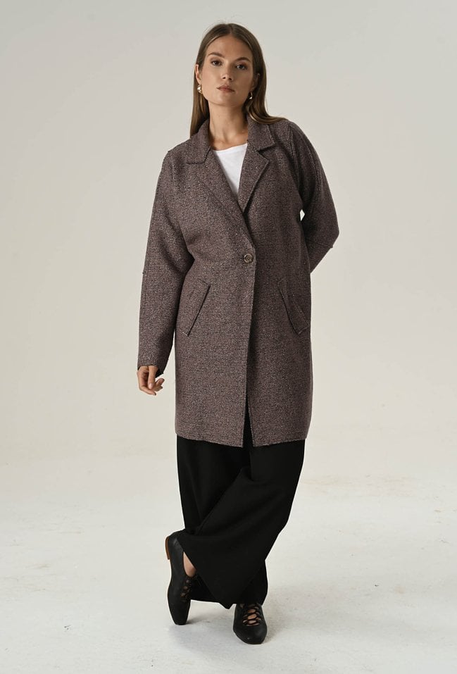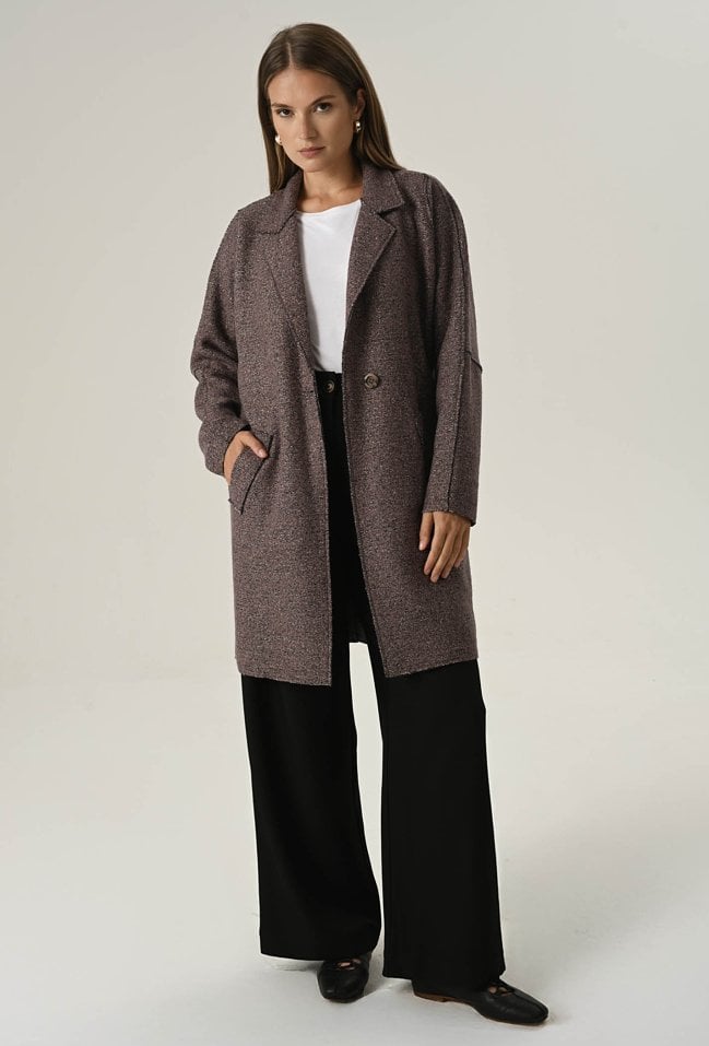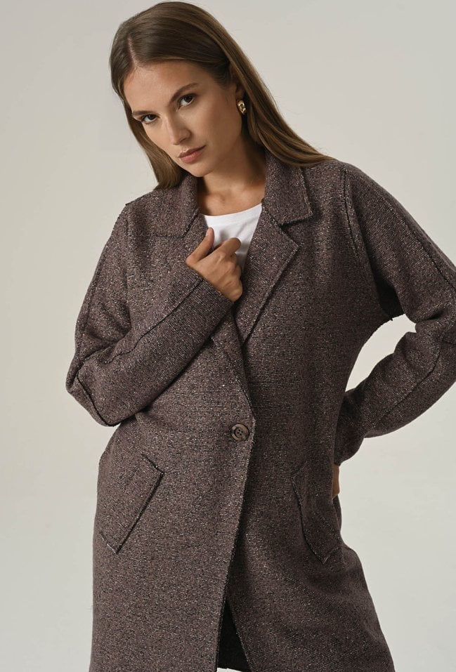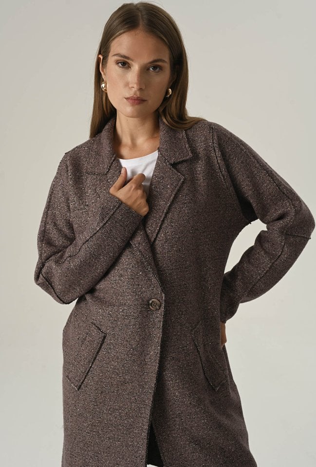 Lekki płaszcz damski o długości midi, wykonany z miękkiej dzianiny z dodatkiem wełny. Bez podszewki, idealny na przejściowe dni. Klasyczny fason zapinany na jeden guzik i praktyczne, wsuwane kieszenie tworzą ponadczasowy model, który dopełni każdą stylizację. Modelka na zdjęciu ma 177 cm wzrostu i prezentuje rozmiar 36/S.