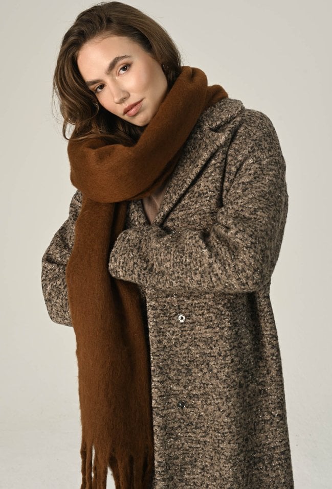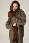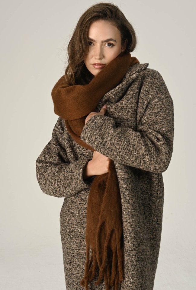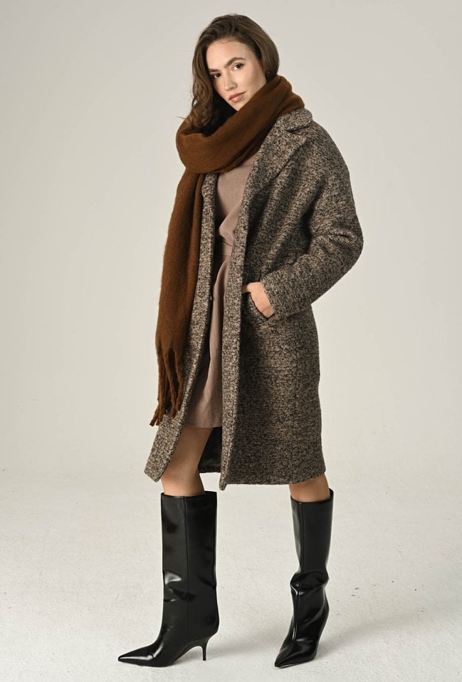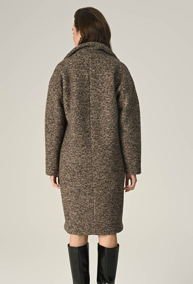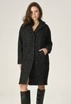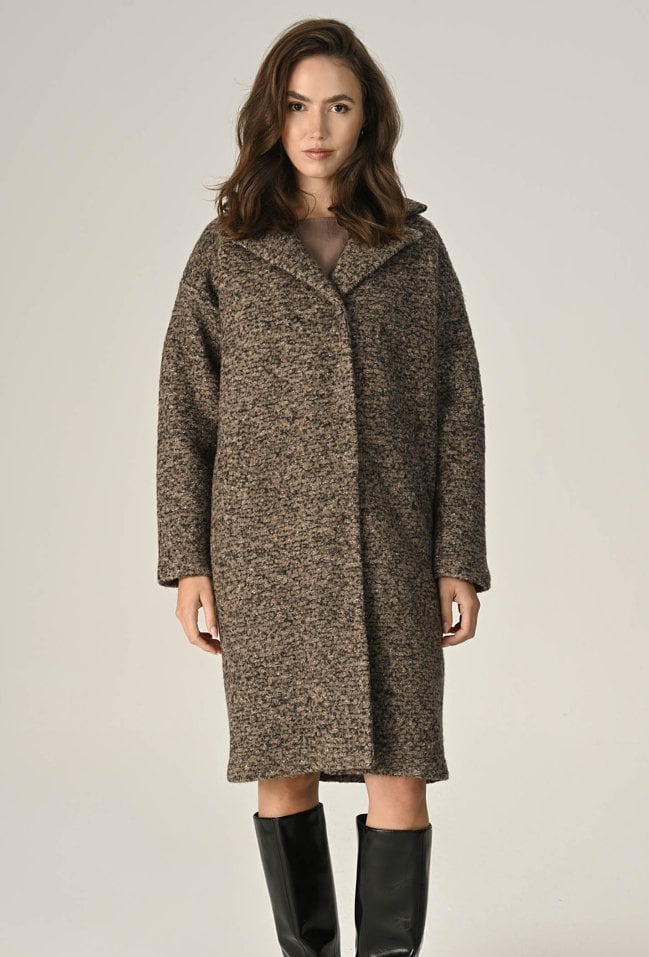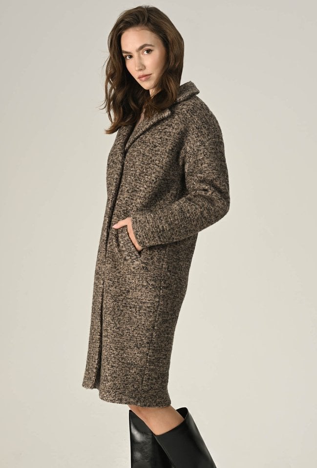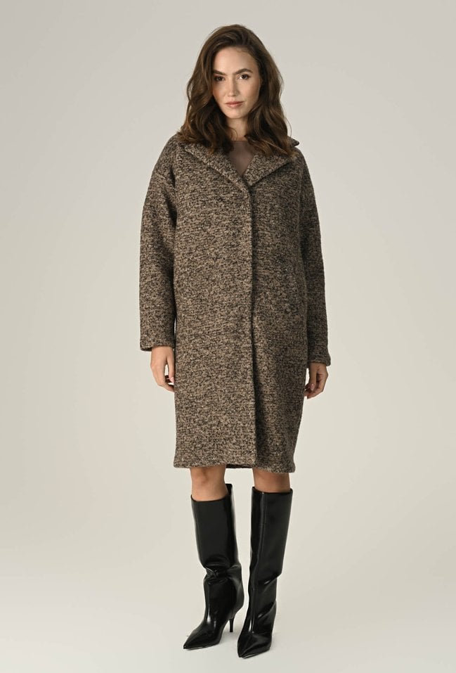 Płaszcz o prostym kroju, wykonany z wysokiej jakości dzianiny z domieszką wełny . Długość nad kolano, lekko obniżona linia ramion. Delikatna jodełka nadaje mu charakteru. Model ten idealnie sprawdzi się do każdej stylizacji zarówno tej bardziej casualowej jak i sportowej. Modelka na zdjęciu ma 174 cm wzrostu i prezentuje rozmiar 36.
