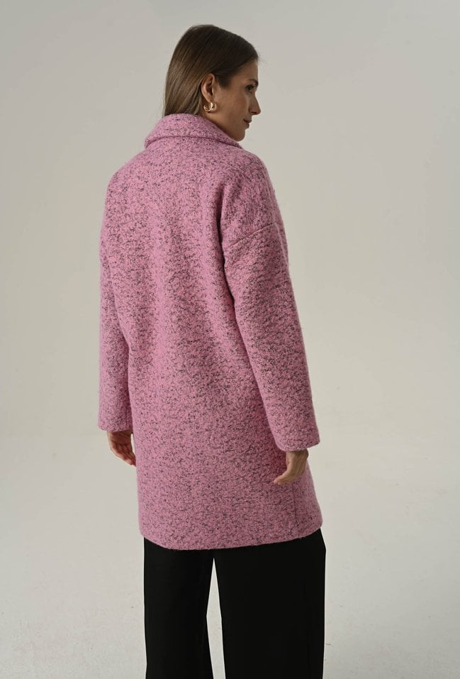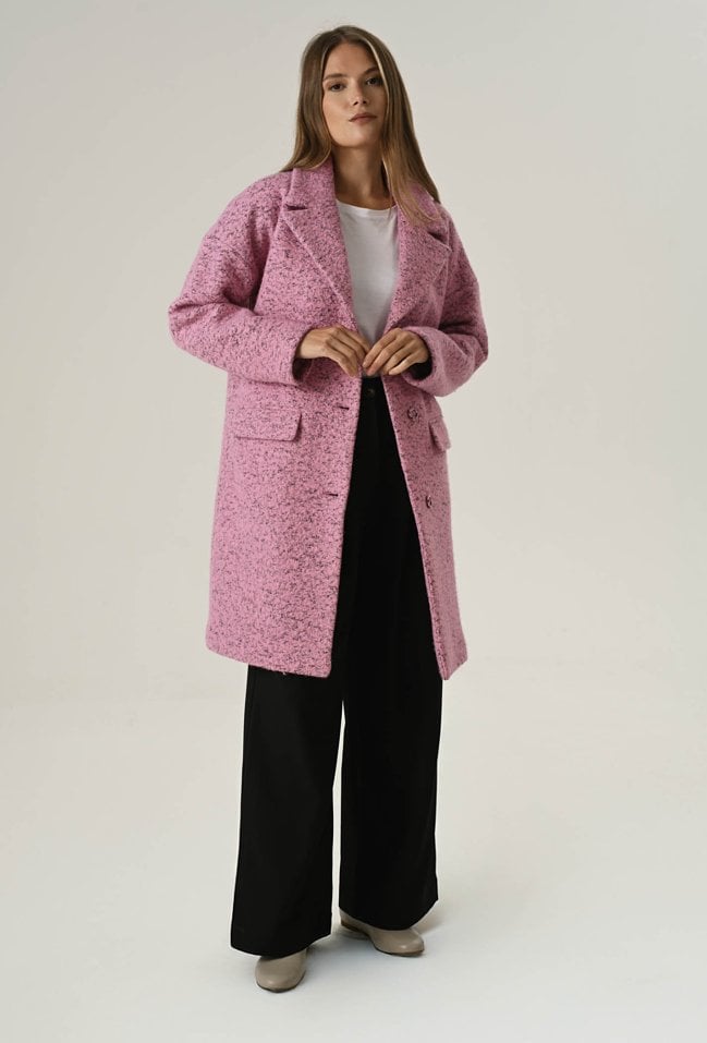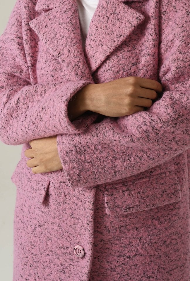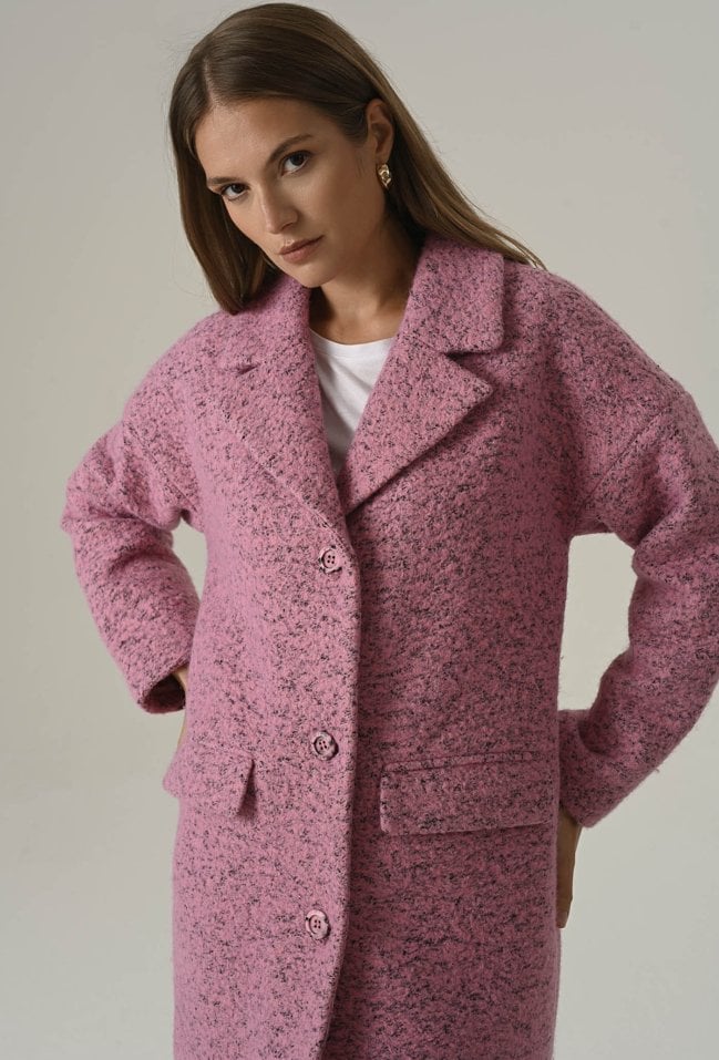 Płaszcz o prostym kroju wykonany z wysokiej jakości dzianiny z domieszką wełny . Długość nad kolano, lekko obniżona linia ramion. Delikatna jodełka nadaje mu charakteru. Model ten idealnie sprawdzi się do każdej stylizacji zarówno tej bardziej casualowej jak i sportowej. Modelka na zdjęciu ma 175 cm wzrostu i prezentuje