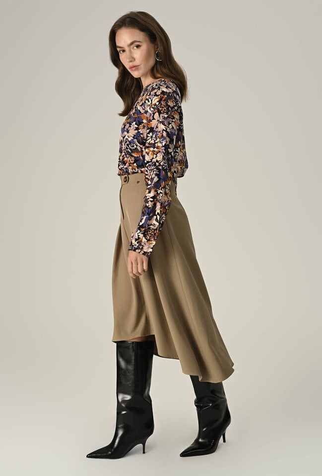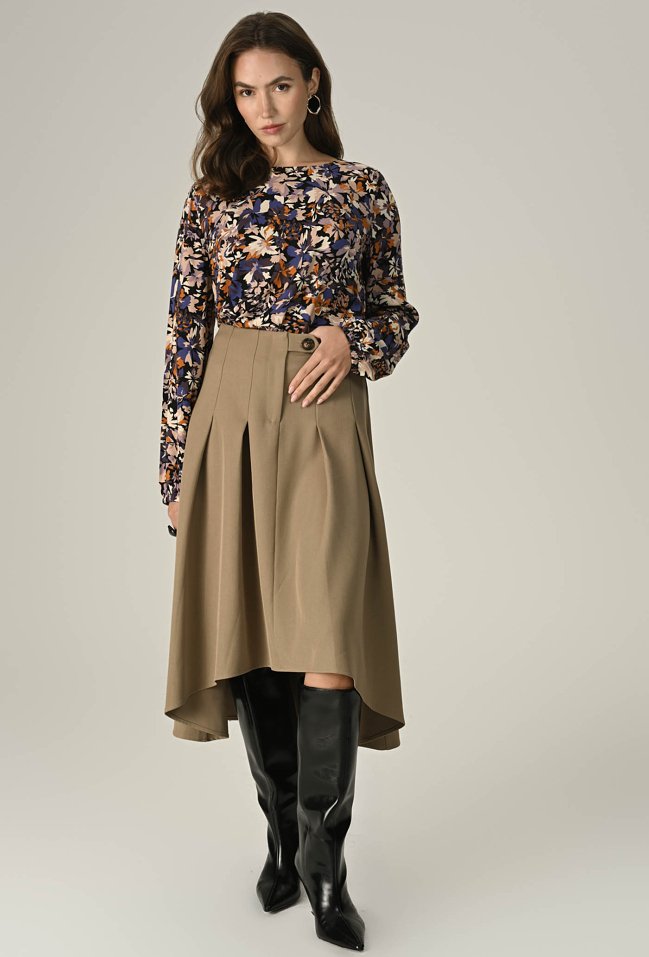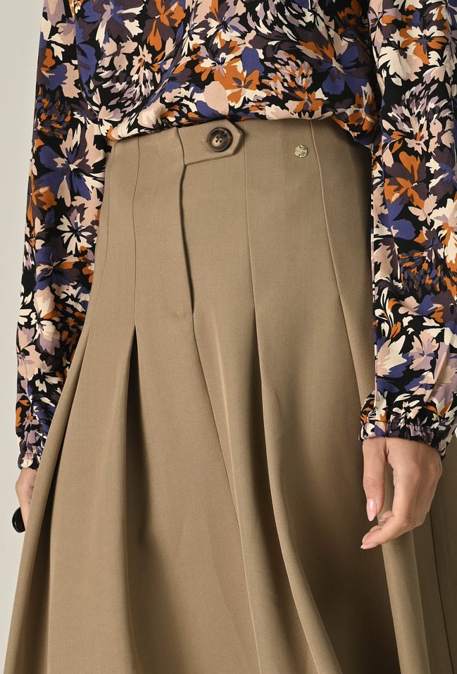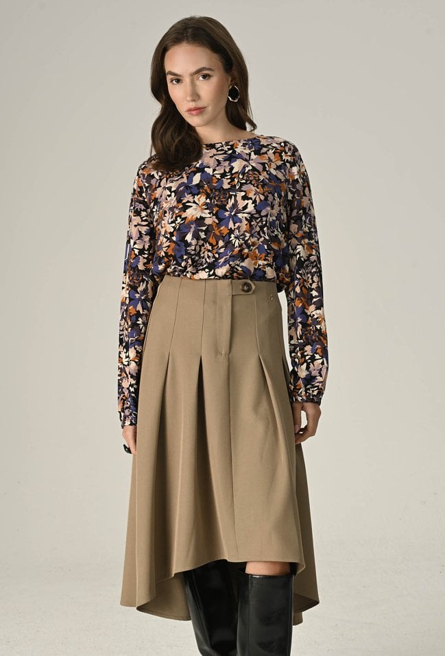 Damska spódnica z plisami na przodzie i wydłużonym tyłem, które nadają jej dynamicznego charakteru. Zamek i guzik z przodu zapewniają wygodę zakładania. Idealna na co dzień, łącząc styl z funkcjonalnością. Modelka na zdjęciu ma 173 cm wzrostu i prezentuje rozmiar 36.