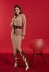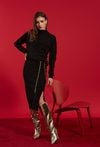 Dopasowana spódnica wykonany z miękkiej dzianiny na bazie wiskozy z ozdobnym warkoczem. Ma klasyczny czarny kolor, który dobrze komponuje się zarówno z paletą barw nude, jak i klasycznymi kolorami. Spódnica występują do kompletu ze swetrem tworząc bardzo kobiecy i modny duet. To idealna propozycja do pracy i na wyjścia ze znajomymi dodatkowo dopasowany krój podkreśla sylwetkę. Modelka na zdjęciu ma 171 cm wzrostu i prezentuje rozmiar S.