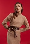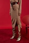 Dopasowana spódnica wykonany z miękkiej dzianiny na bazie wiskozy z ozdobnym warkoczem. Ma modny odcień beżowego melanżu, który dobrze komponuje się zarówno z paletą barw nude, jak i klasycznymi kolorami. Spódnica występują do kompletu ze swetrem tworząc bardzo kobiecy i modny duet. To idealna propozycja do pracy i na wyjścia ze znajomymi dodatkowo dopasowany krój podkreśla sylwetkę. Modelka na zdjęciu ma 171 cm wzrostu i prezentuje rozmiar S.