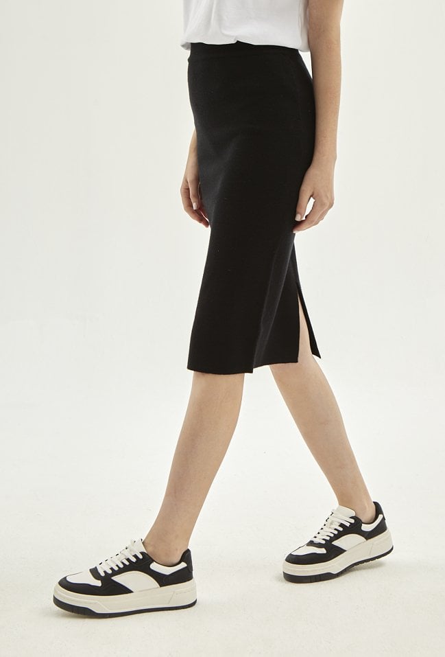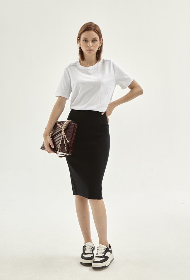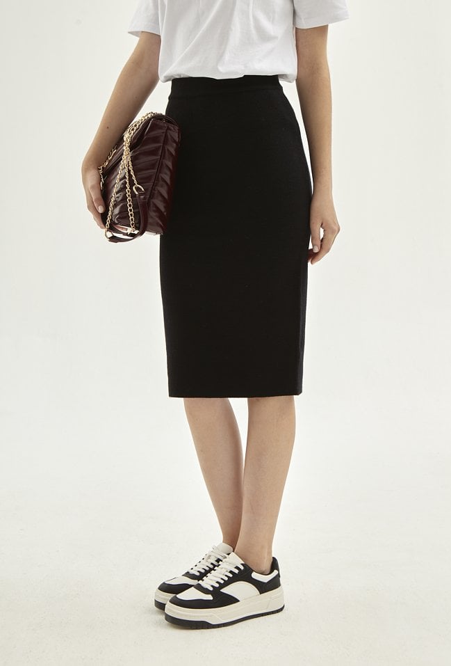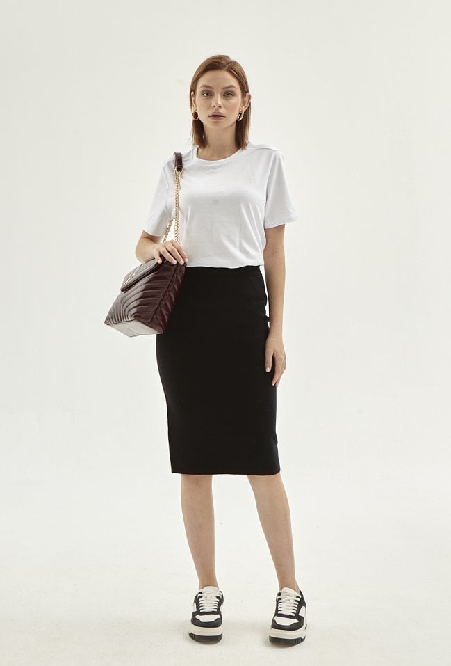 Wiskozowa ołówkowa spódnica sięgająca do kolan, z miękkiej i przyjemnej w dotyku wiskozy. Spódnica w pasie posiada elastyczną gumkę, oraz pękniecie z tyłu. Model ten idealnie sprawdzi się na wyjątkowe okazję jak i do pracy. Modelka na zdjęciu ma 177cm wzrostu i prezentuje rozmiar S.