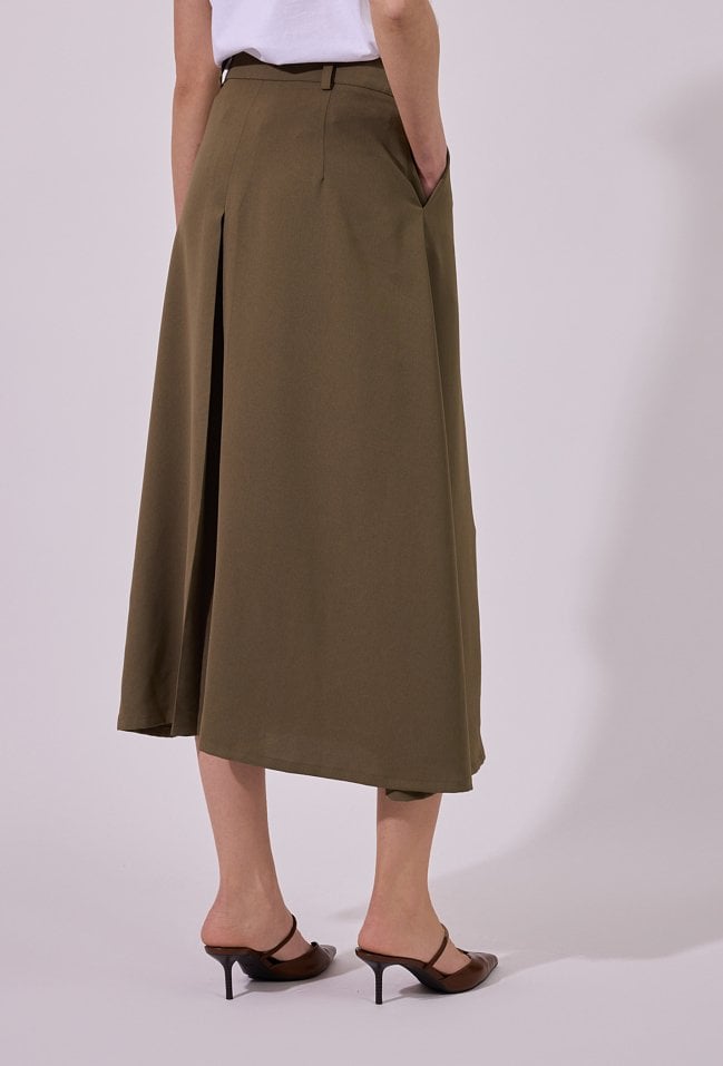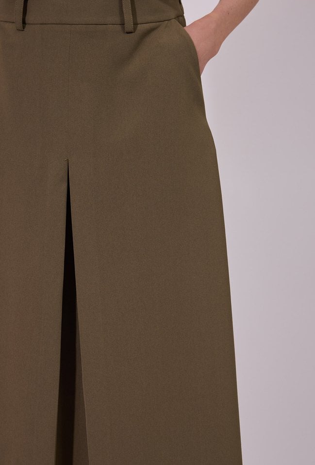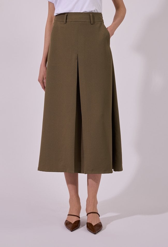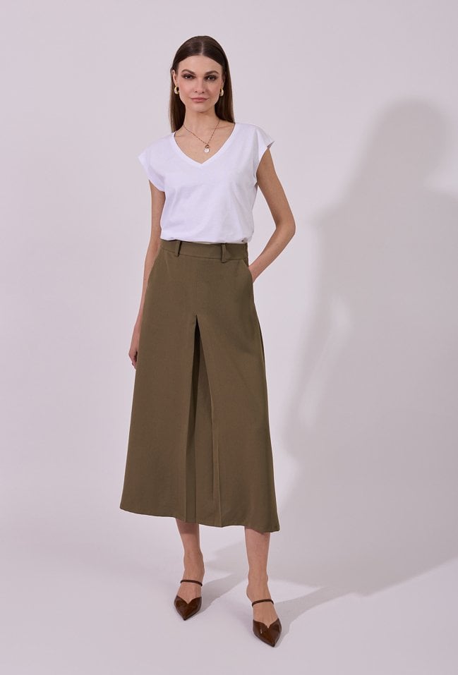 Spódnica damska o eleganckim, rozkloszowanym kroju midi. Model z wysokim stanem oraz subtelną zakładką z przodu, która nadaje całości nowoczesnego charakteru i zapewnia swobodę ruchów. Klasyczne szlufki w pasie umożliwiają stylizację z paskiem. Modelka na zdjęciu ma 177 cm wzrostu i prezentuje rozmiar 36.