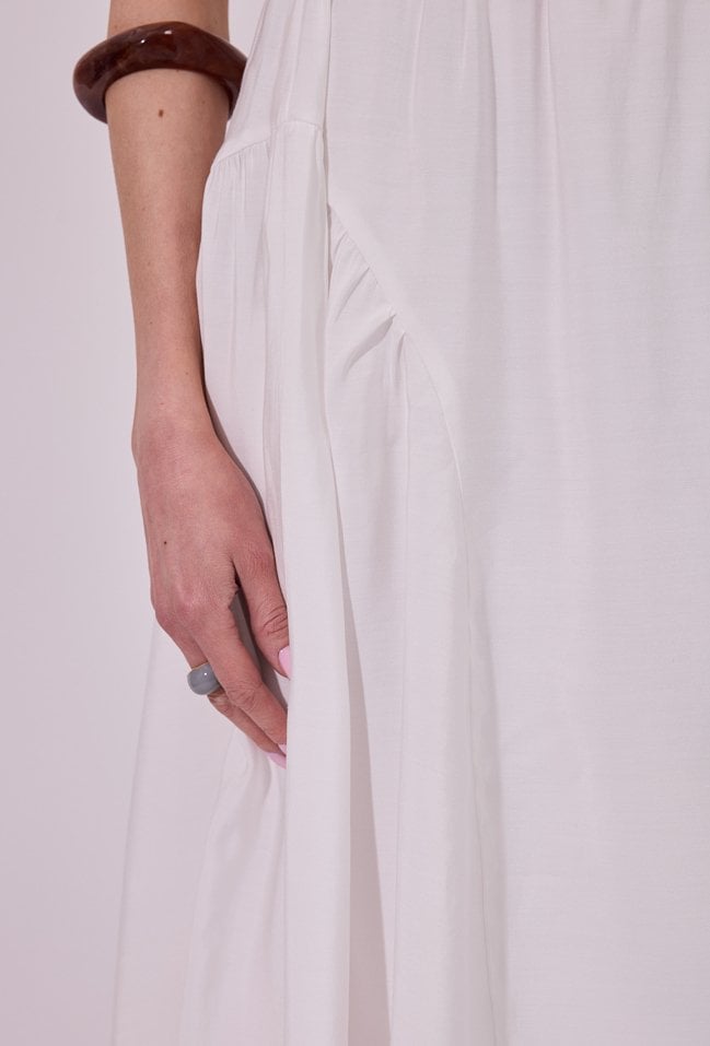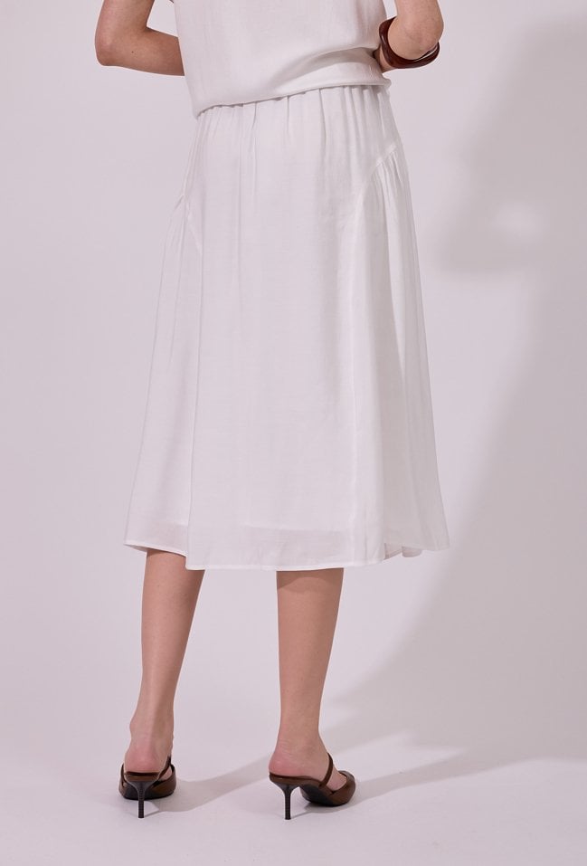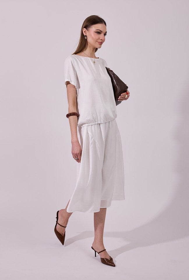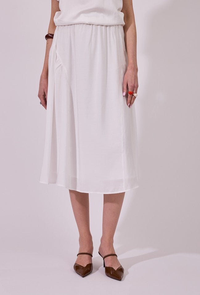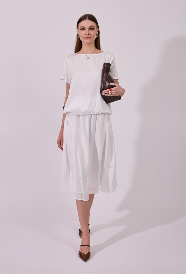 Spódnica damska o zwiewnym, rozkloszowanym kroju midi. Model z wysokim stanem i delikatnym marszczeniem w pasie, które nadaje całości lekkości i kobiecego charakteru. Modelka na zdjęciu ma 177 cm wzrostu i prezentuje rozmiar 36.