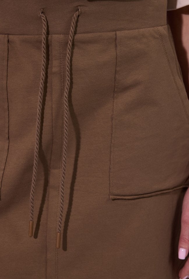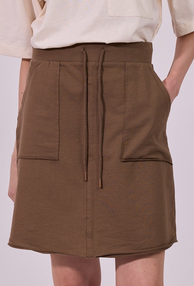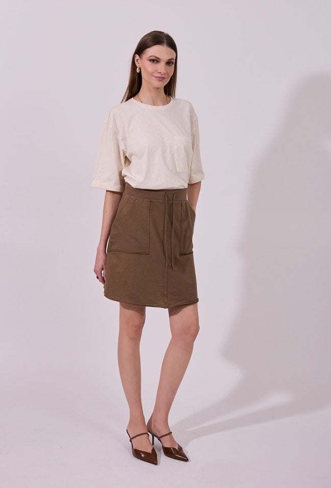 Spódnica damska o prostym, lekko dopasowanym kroju przed kolano. Model z wysokim stanem, wyposażony w praktyczne, naszywane kieszenie z przodu, które nadają całości casualowego charakteru. W pasie znajduje się wiązanie, pozwalające na lepsze dopasowanie i podkreślenie talii. Doskonała do codziennych stylizacji w miejskim, swobodnym stylu. Modelka na zdjęciu ma 177 cm wzrostu i prezentuje rozmiar S.
