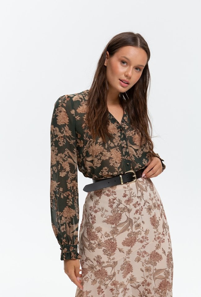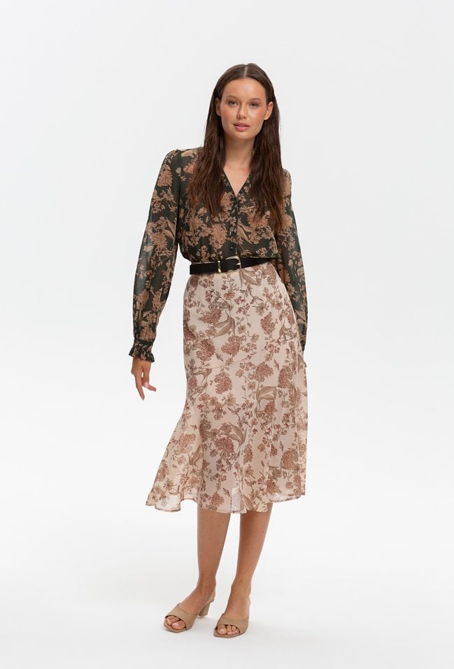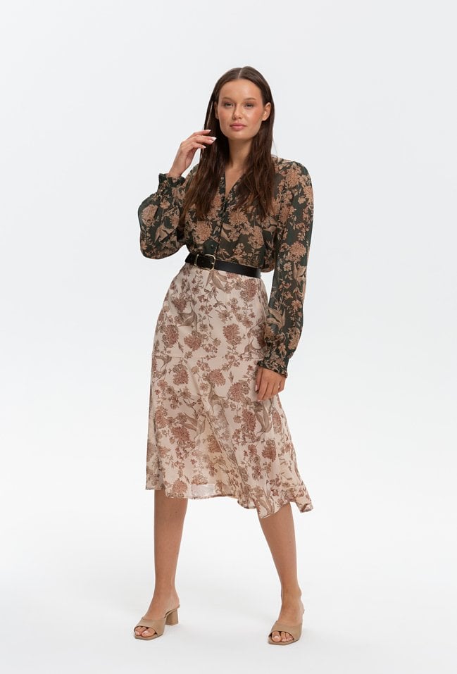 Spódnica damska z motywem kwiatów, zapinana na suwak z boku. Lekko rozszerzony dół zapewniając wygodę podczas noszenia jednocześnie wyglądając szykownie. Spódnica wykonana jest z przezroczystej tkaniny co daje jej lekkości. Występuje do kompletu z bluzką. Ten model będzie idealną bazą do codziennych stylizacji. Modelka na zdjęciu ma 174 cm wzrostu i prezentuje rozmiar 36.