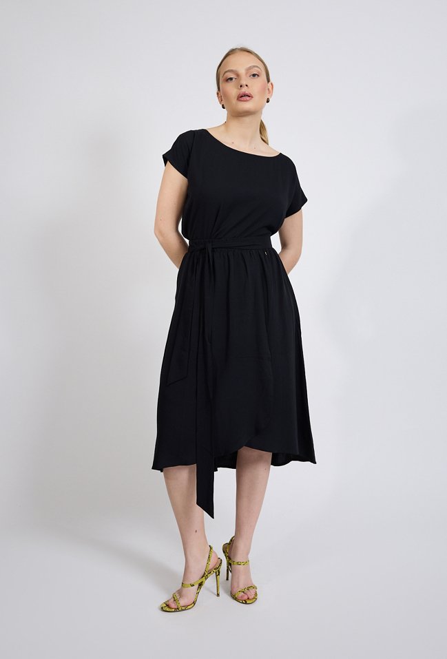 Spódnica damska o długości midi w eleganckim, kobiecym stylu. Model o rozkloszowanym kroju, który pięknie układa się na sylwetce i zapewnia swobodę ruchów. W talii znajduje się wiązanie, które pozwala na dopasowanie spódnicy i jednocześnie stanowi subtelny element dekoracyjny. Damska spódnica doskonale sprawdzi się zarówno w stylizacjach codziennych, jak i bardziej eleganckich. Modelka na zdjęciu ma 177 cm wzrostu i prezentuje rozmiar 36.