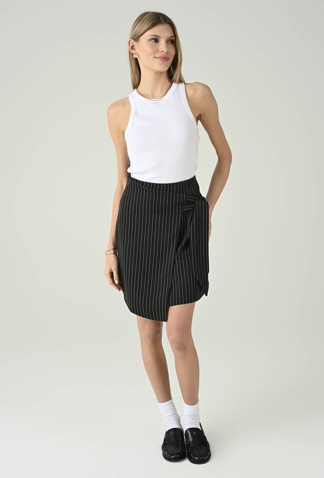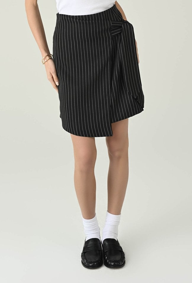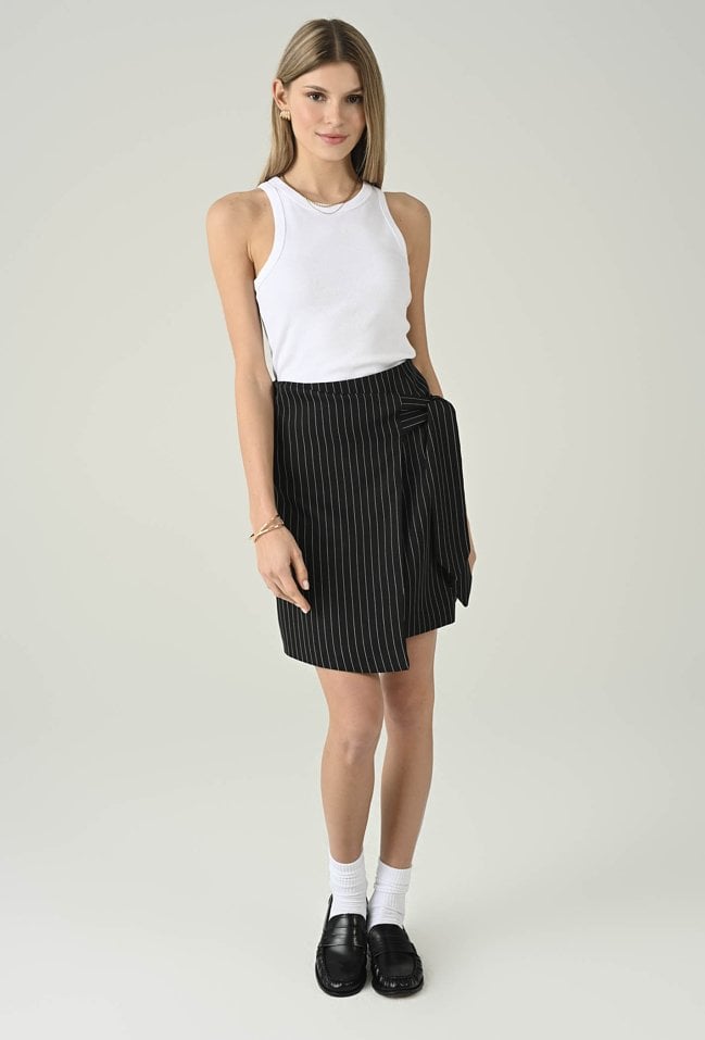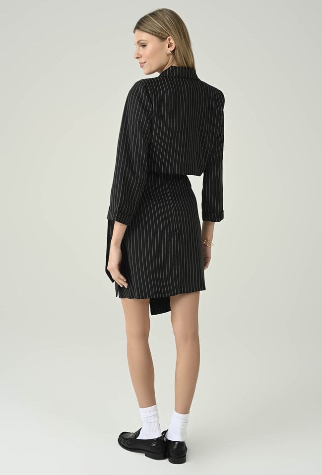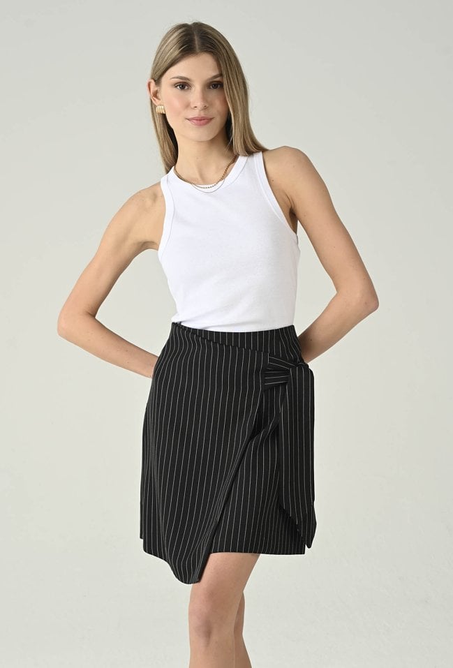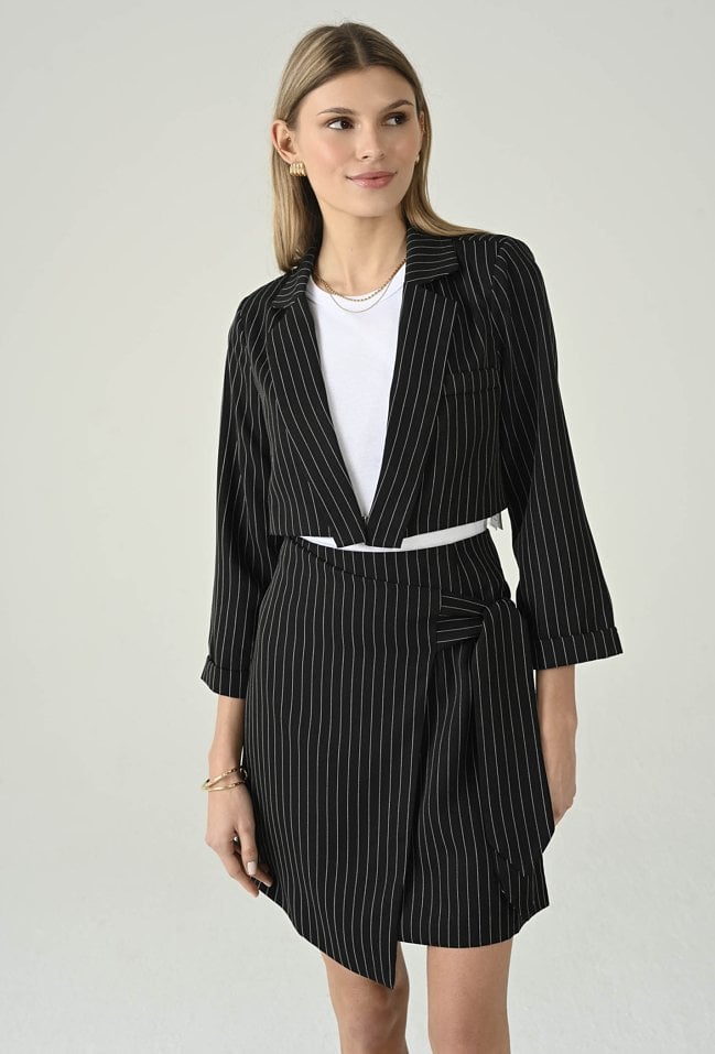 Krótka spódnica w klasyczny prążek, która łączy elegancję z modowym charakterem. Tworzy stylowy zestaw z marynarką, a wygodna podszewka zapewnia komfort noszenia. Kryty zamek z tyłu ułatwia zakładanie, a efektowne wiązanie na przodzie dodaje całości nowoczesnego i wyrazistego akcentu. Idealna do biura, jak i na stylowe wyjścia. Modelka na zdjęciu ma 177 cm wzrostu i prezentuje rozmiar 36.