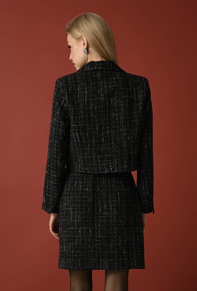 Elegancka spódnica mini to idealny wybór dla miłośniczek klasycznych fasonów z nowoczesnym akcentem. Wykonana z materiału imitującego tweed, zachwyca swoją strukturą i stylowym wyglądem. Delikatne pęknięcie z przodu dodaje kobiecego charakteru i subtelnej zmysłowości, jednocześnie zapewniając komfort noszenia. Spódnica tworzy komplet z marynarką – razem stanowią perfekcyjny duet na spotkania biznesowe, wieczorne wyjścia lub eleganckie okazje. Modelka ma 177 cm wzrostu i ma na sobie rozmiar 36.