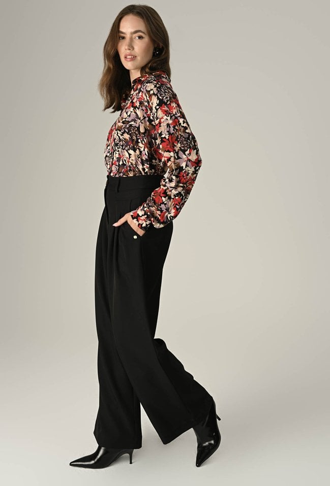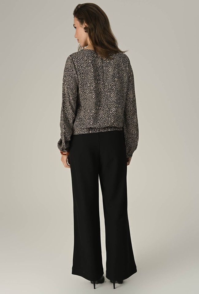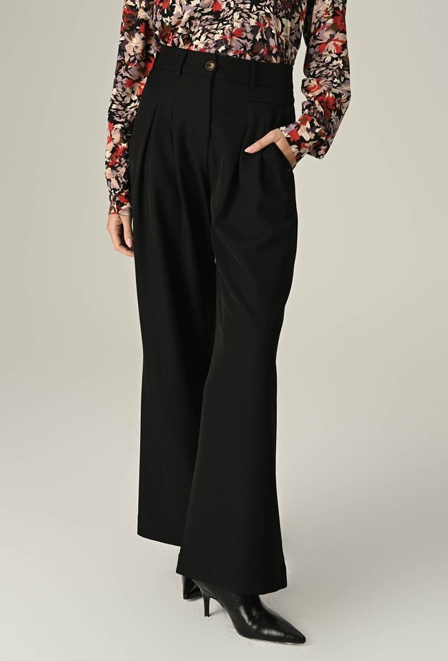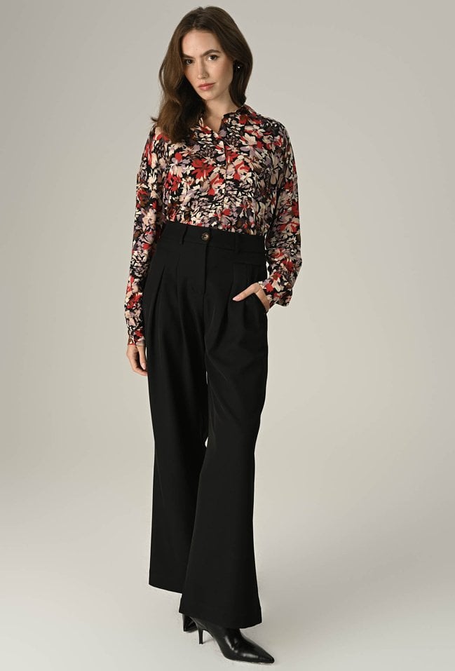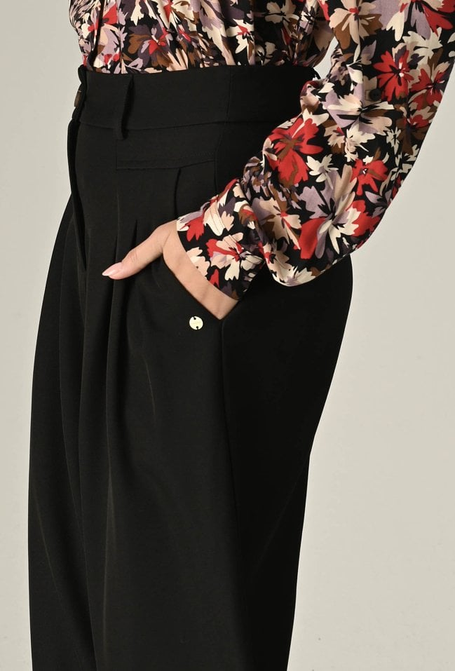 Spodnie o klasycznym fasonie, przyjemnego materiału, z szeroką nogawką i wysokim stanem, które doskonale podkreślają sylwetkę. Wyposażone w praktyczne kieszenie, są idealne do codziennych stylizacji, łącząc wygodę z elegancją. Modelka na zdjęciu ma 174 cm wzrostu i prezentuje rozmiar 36.