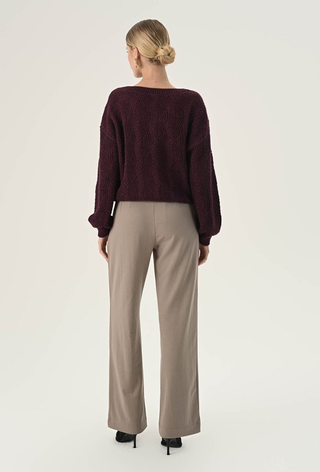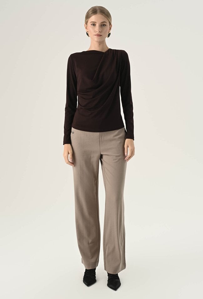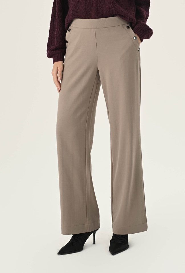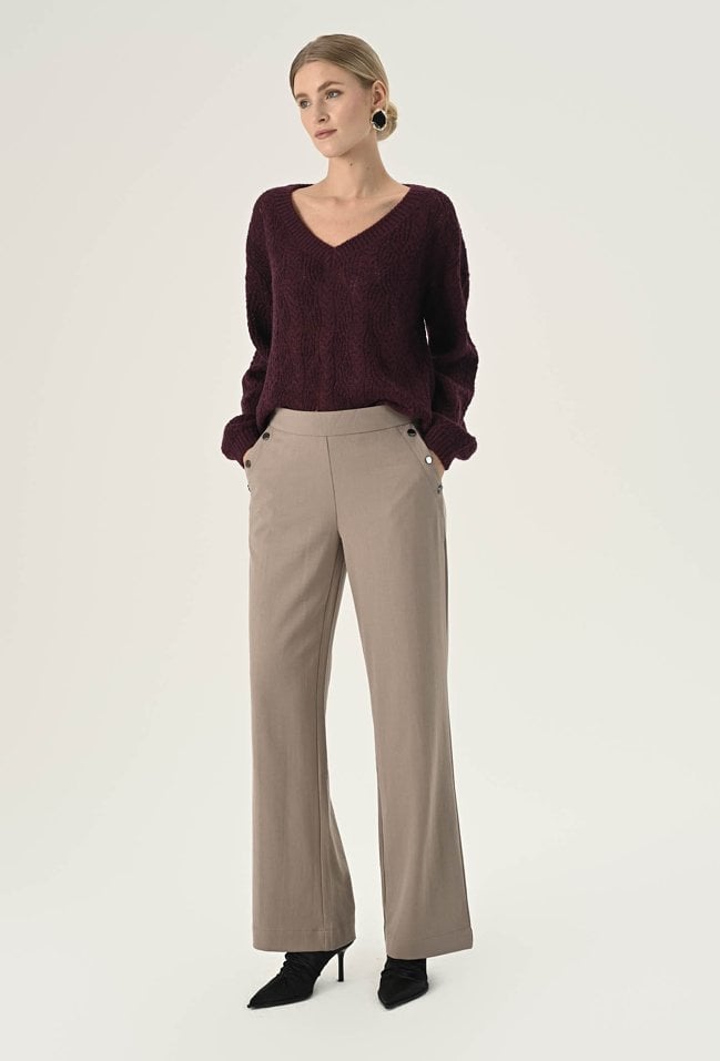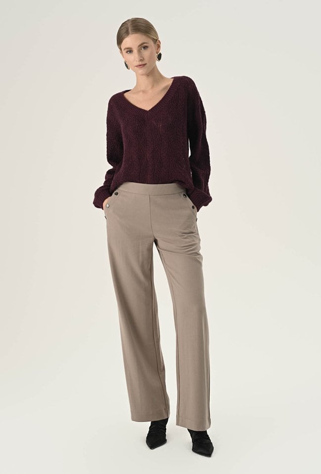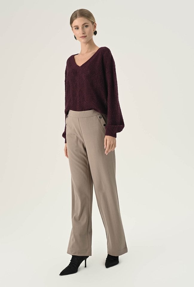 Eleganckie spodnie z wysokim stanem w beżowym kolorze to kluczowy element każdej jesiennej garderoby, który łączy w sobie wygodę i styl. Stylu dodają i ozdobne guziki. Rozszerzane ku dołowi nogawki dodają lekkości i sprawiają, że spodnie są bardzo stylowe. Wysoki stan podkreśla talię, co wysmukla sylwetkę i czyni te spodnie idealnym wyborem do różnych stylizacji. Modelka na zdjęciu ma 179 cm wzrostu i prezentuje rozmiar 36.