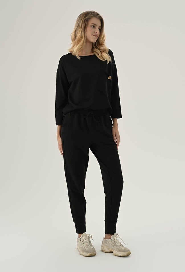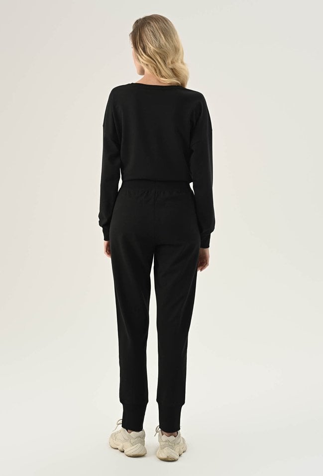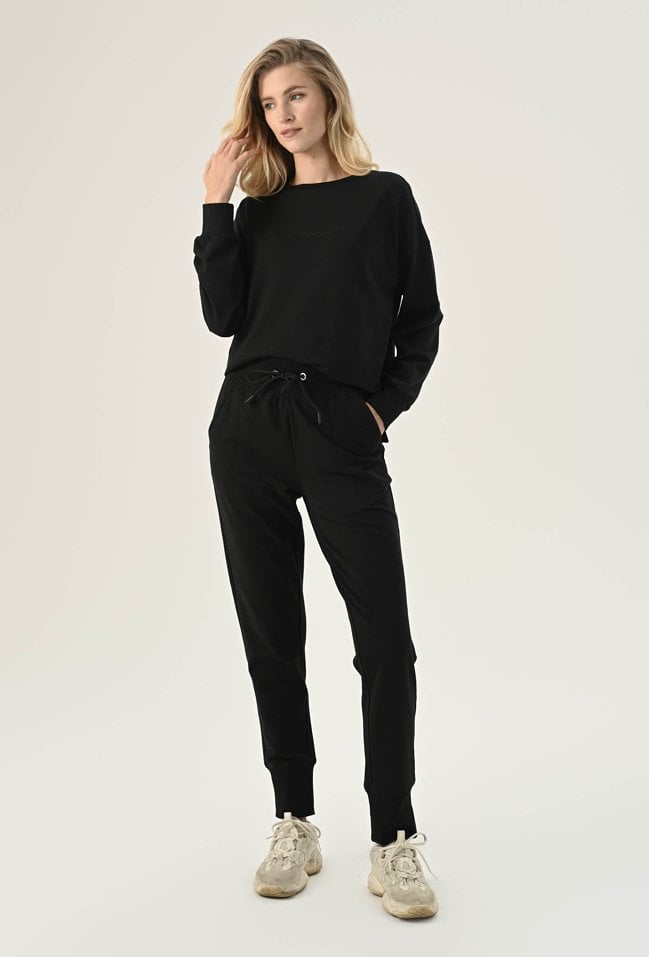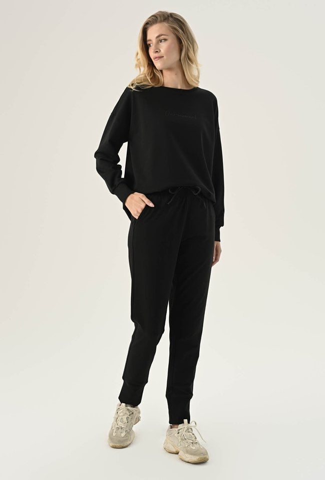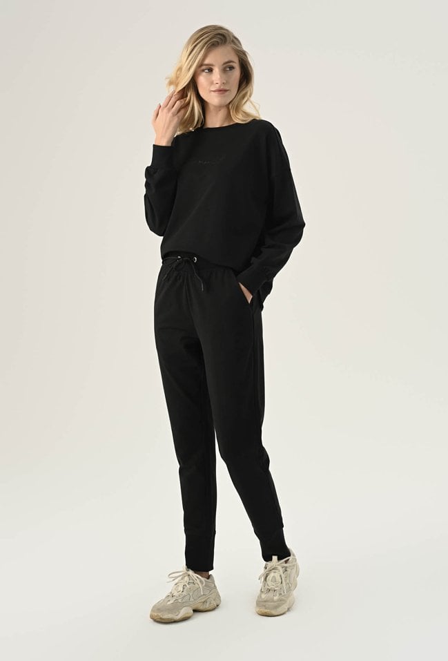 Stylowe i wygodne spodnie dresowe wykonane z miękkiej bawełnianej dzianiny to idealny wybór na co dzień. Zwężane nogawki zakończone wysokim ściągaczem nadają sylwetce lekkości i podkreślają sportowy charakter. Wysoka guma w pasie zapewnia świetne dopasowanie i komfort noszenia. Doskonałe do aktywnego trybu życia i codziennego relaksu. Modelka na zdjęciu ma 177 cm wzrostu i prezentuje rozmiar S.