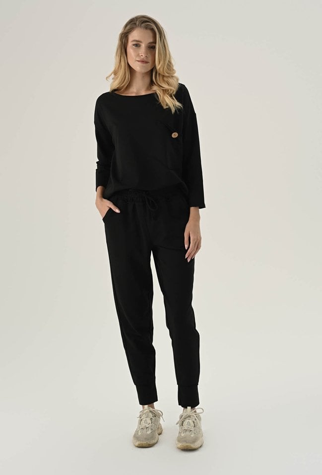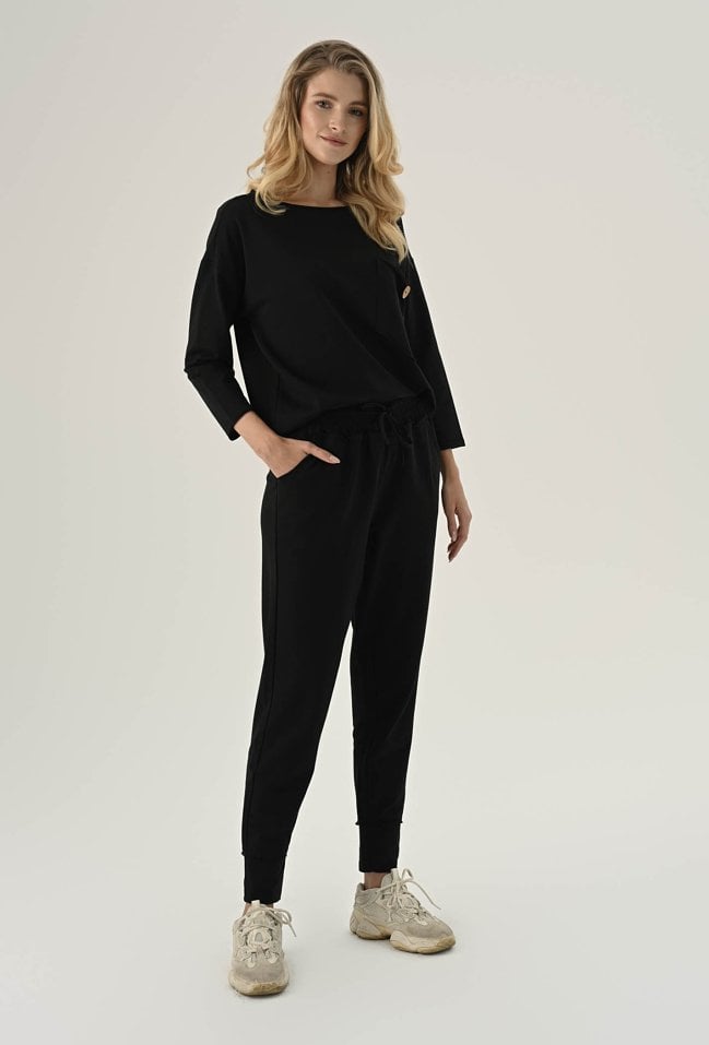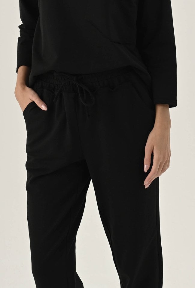 Stylowe i wygodne spodnie dresowe wykonane z miękkiej bawełnianej dzianiny to idealny wybór na co dzień. Zwężane nogawki zakończone wysokim ściągaczem nadają sylwetce lekkości i podkreślają sportowy charakter. Wysoka guma w pasie zapewnia świetne dopasowanie i komfort noszenia. Doskonałe do aktywnego trybu życia i codziennego relaksu. Modelka na zdjęciu ma 177 cm wzrostu i prezentuje rozmiar S.