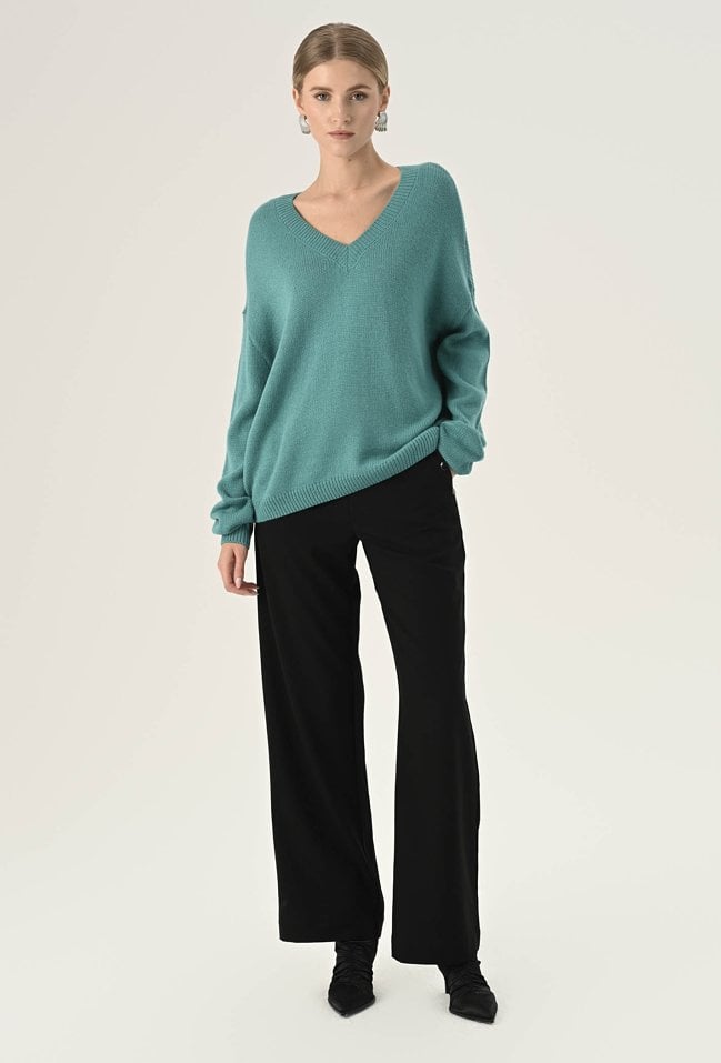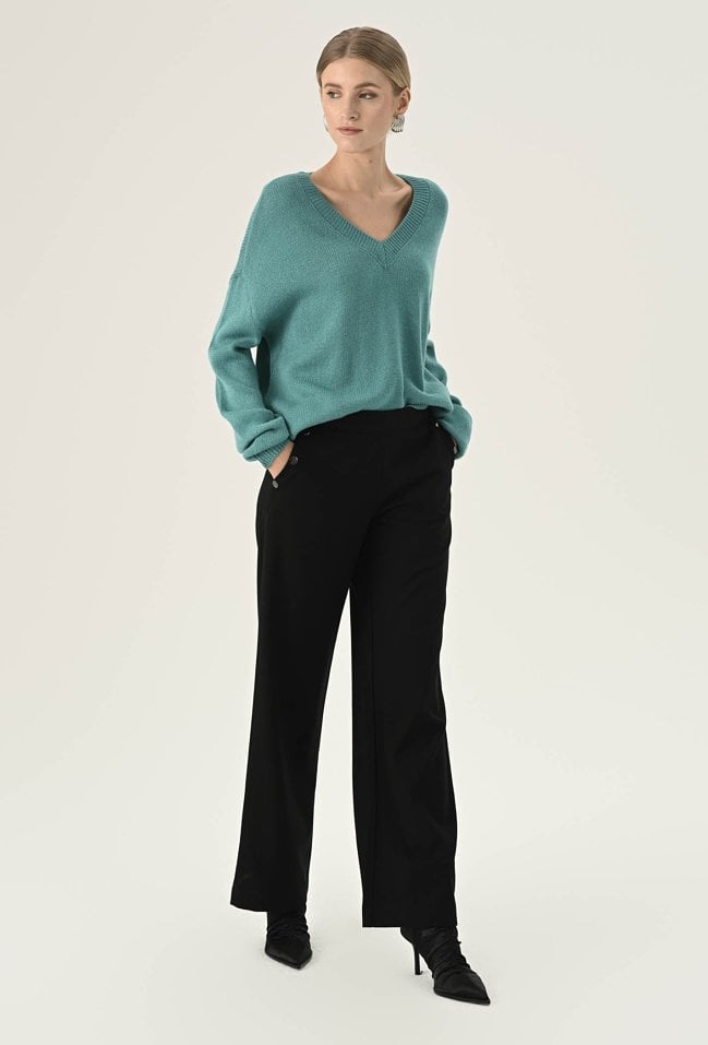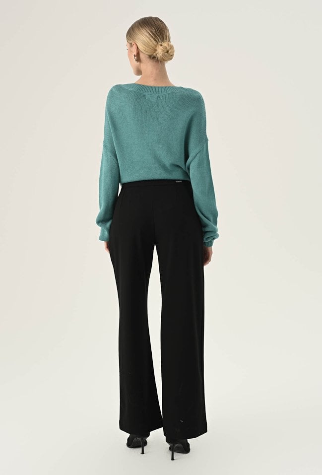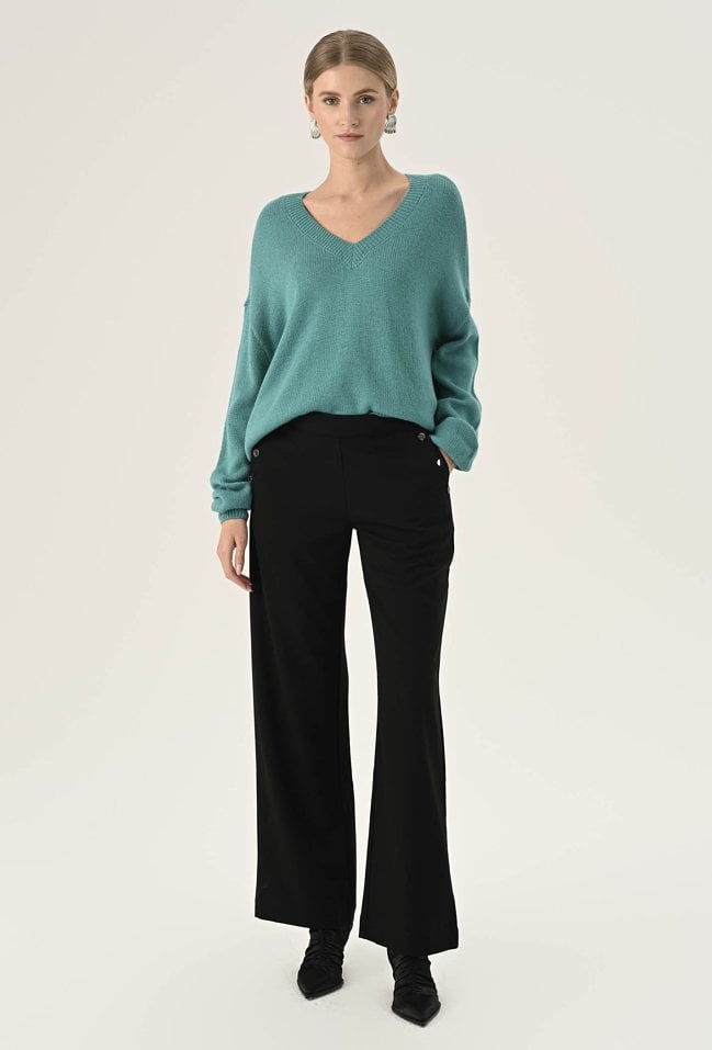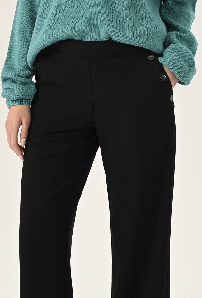 Eleganckie spodnie z wysokim stanem w klasycznym czarnym kolorze to kluczowy element każdej jesiennej garderoby, który łączy w sobie wygodę i styl. Stylu dodają i ozdobne guziki. Rozszerzane ku dołowi nogawki dodają lekkości i sprawiają, że spodnie są bardzo stylowe. Wysoki stan podkreśla talię, co wysmukla sylwetkę i czyni te spodnie idealnym wyborem do różnych stylizacji. Modelka na zdjęciu ma 179 cm wzrostu i prezentuje rozmiar 36.
