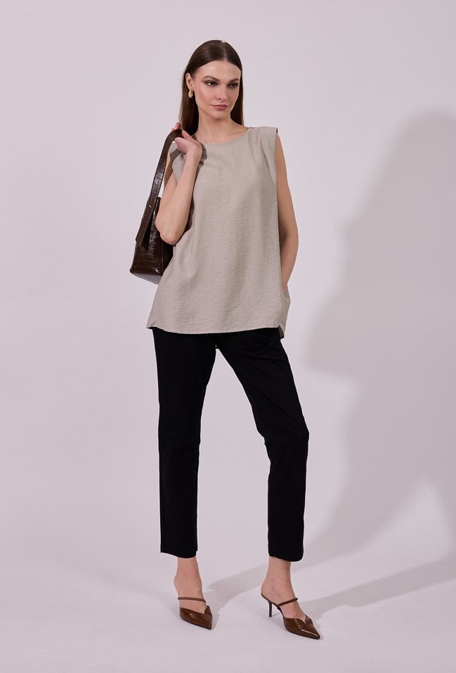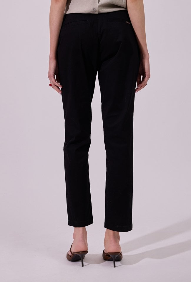 Spodnie damskie o klasycznym kroju z nogawką o długości 7/8. Model z wysokim stanem, wyposażony w zakładki z przodu, które zapewniają wygodę i eleganckie ułożenie na sylwetce. Klasyczne kieszenie oraz szlufki w pasie umożliwiają stylizację z paskiem, podkreślając talię. Doskonale sprawdzą się zarówno w codziennych, jak i bardziej eleganckich zestawieniach. Modelka na zdjęciu ma 177 cm wzrostu i prezentuje rozmiar 36.