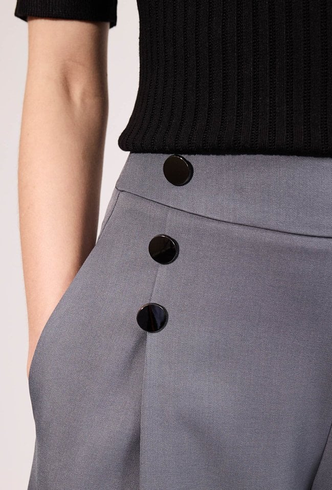 Eleganckie spodnie damskie o szerokiej nogawce i wysokim stanie. Model z ozdobnymi guzikami przy pasie, które nadają całości stylowego charakteru. Spodnie zapewniają wygodę i pięknie układają się na sylwetce, doskonale sprawdzając się w eleganckich i biznesowych stylizacjach. Modelka na zdjęciu ma 177 cm wzrostu i prezentuje rozmiar 36.