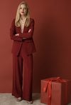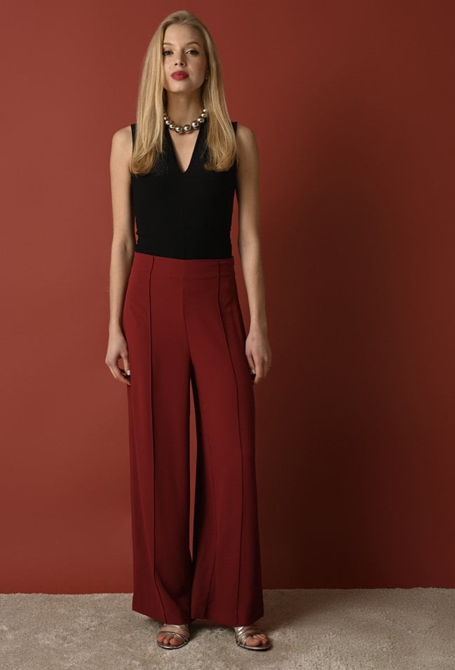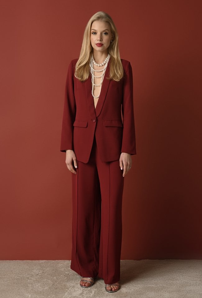 Eleganckie spodnie garniturowe o wysokim stanie, zaprojektowane z myślą o podkreśleniu sylwetki. Szerokie nogawki zapewniają komfort i modny wygląd, a przeszycie optycznie wyszczupla nogi. Model zapinany na kryty zamek, co gwarantuje schludne i estetyczne wykończenie. Idealne do formalnych stylizacji oraz biznesowych outfitów. Tworzy komplet z marynarką FEM-BZR1000-25Z. Modelka na zdjęciu ma 177 cm wzrostu i prezentuje rozmiar 36.