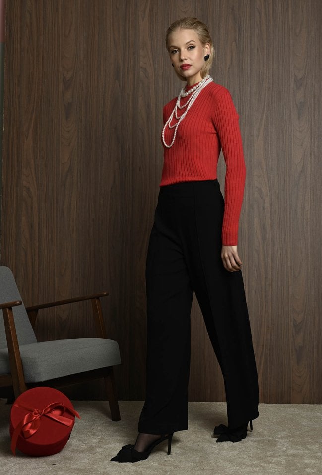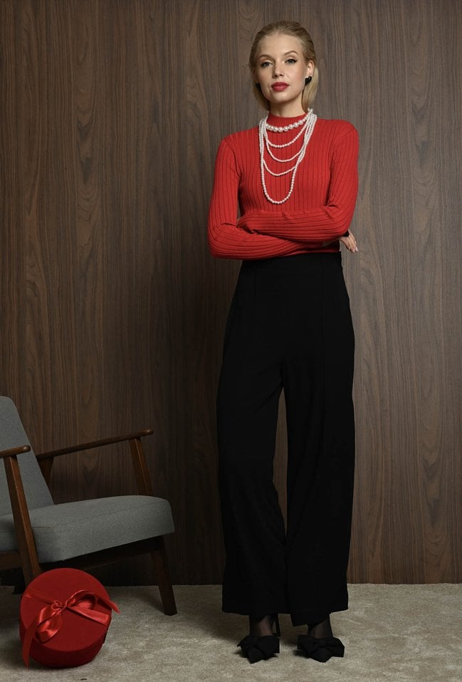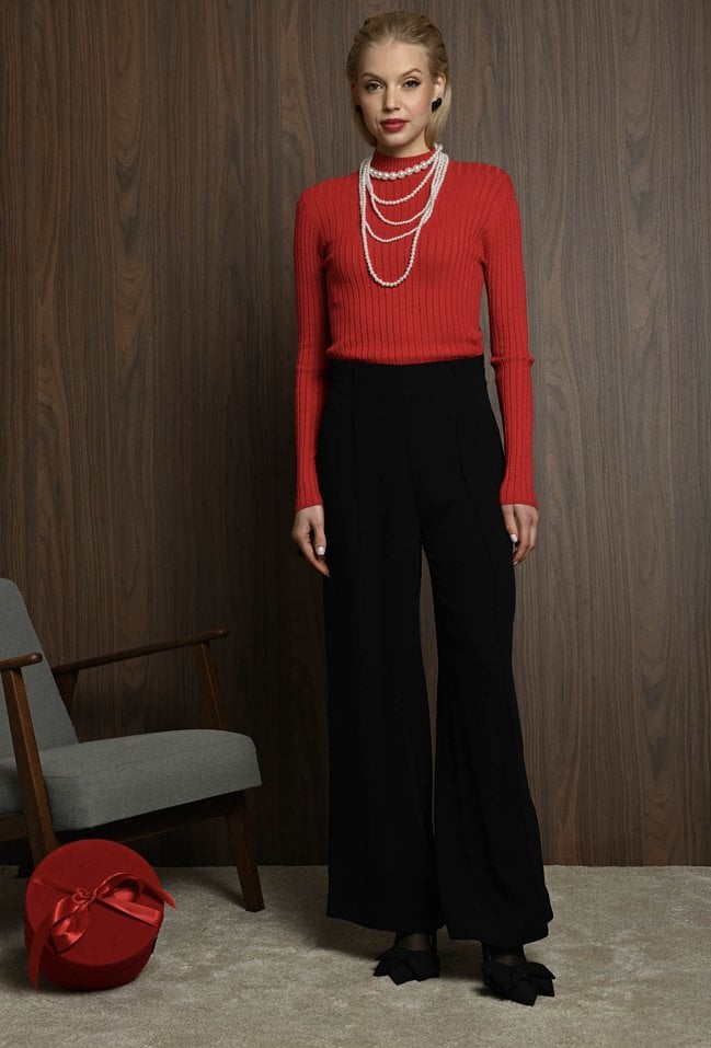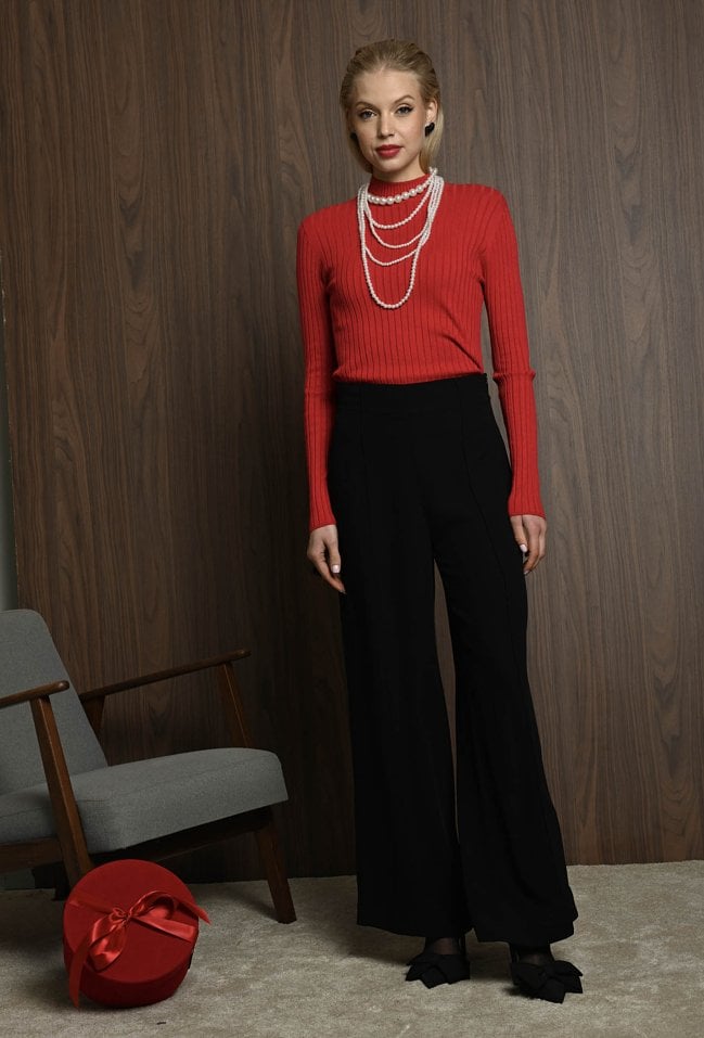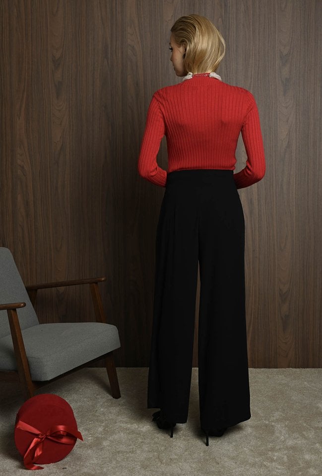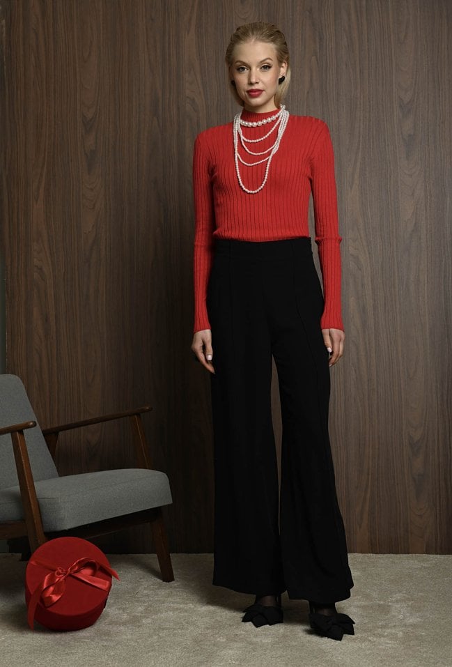 Eleganckie spodnie garniturowe o wysokim stanie, zaprojektowane z myślą o podkreśleniu sylwetki. Szerokie nogawki zapewniają komfort i modny wygląd, a przeszycie optycznie wyszczupla nogi. Model zapinany na kryty zamek, co gwarantuje schludne i estetyczne wykończenie. Idealne do formalnych stylizacji oraz biznesowych outfitów. Tworzy komplet z marynarką FEM-BZR1000-25Z. Modelka na zdjęciu ma 177 cm wzrostu i prezentuje rozmiar 36.