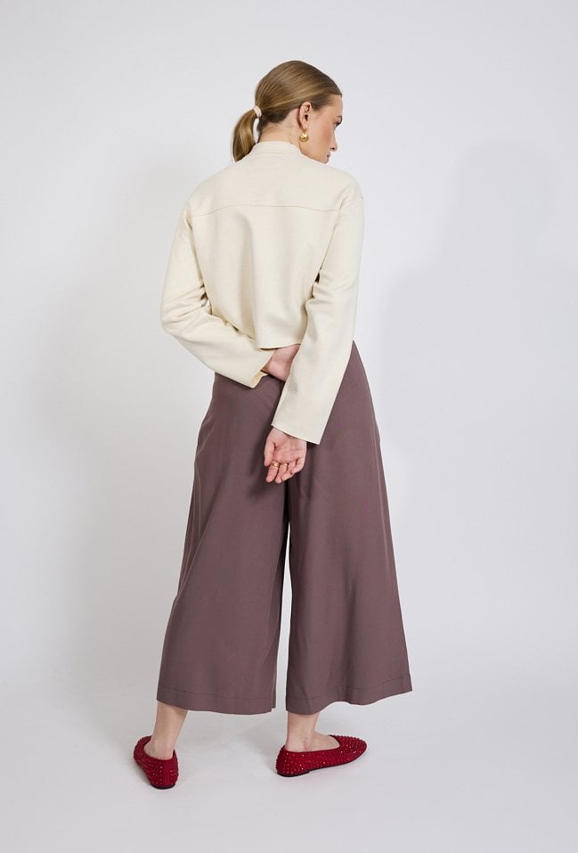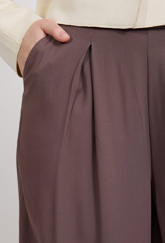 Spodnie damskie o szerokim, eleganckim kroju. Model z wysokim stanem oraz szerokimi nogawkami o długości 7/8, które nadają stylizacji lekkości i nowoczesnego charakteru. Z przodu znajdują się subtelne zakładki, a po bokach praktyczne kieszenie. Damskie spodnie doskonale sprawdzą się zarówno w stylizacjach eleganckich, jak i codziennych. Modelka na zdjęciu ma 177 cm wzrostu i prezentuje rozmiar 36.