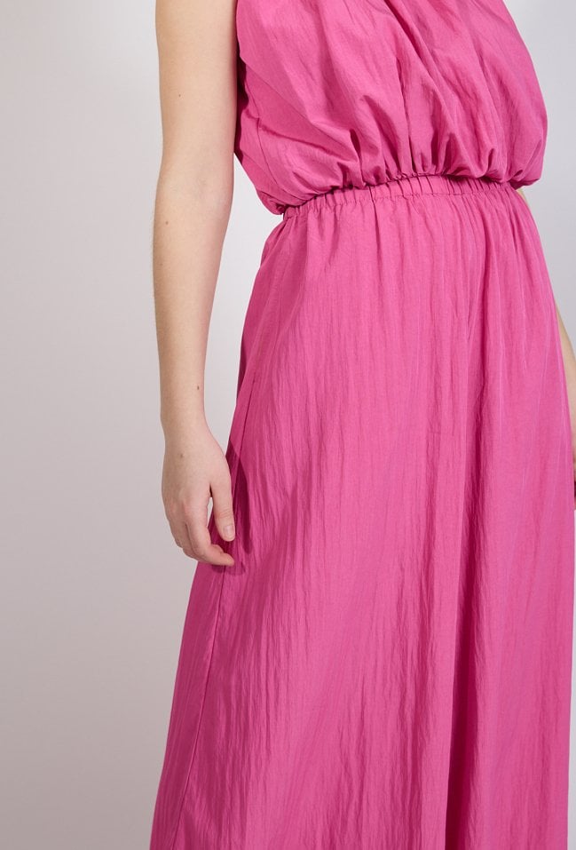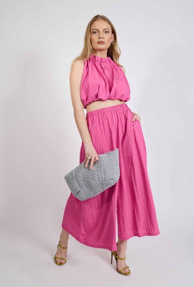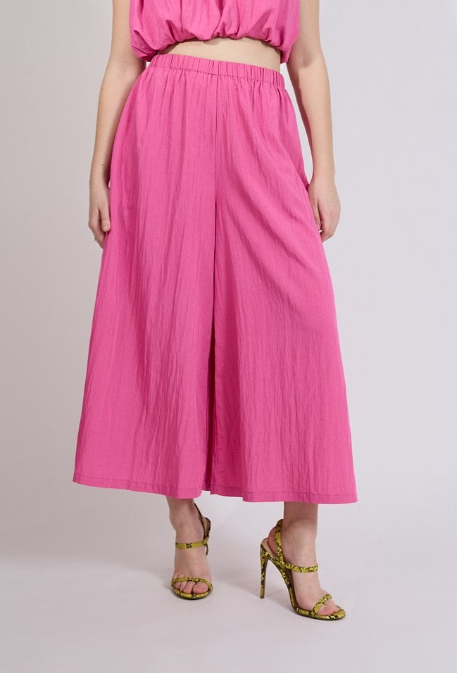 Stylowe spodnie damskie o luźnym kroju z szeroką nogawką o długości 7/8. Model z elastycznym pasem, który zapewnia wygodę i dobre dopasowanie do sylwetki. Spodnie doskonale sprawdzą się w letnich stylizacjach, na spotkania oraz wakacyjne wyjazdy, dodając stylizacji lekkości i koloru. Modelka na zdjęciu ma 177 cm wzrostu i prezentuje rozmiar 36.