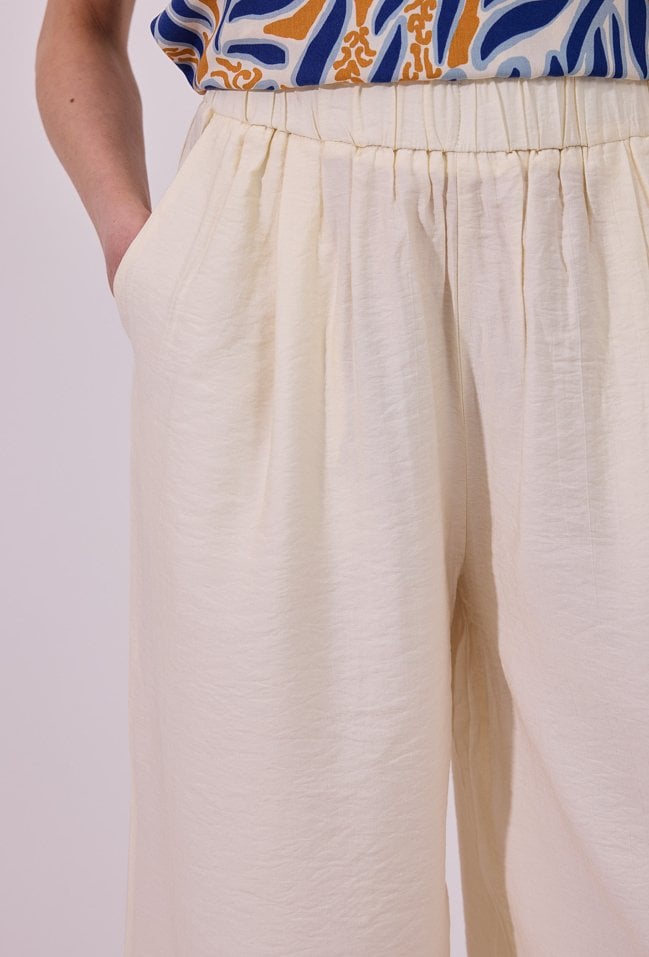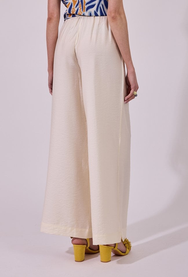 Spodnie damskie o luźnym, szerokim kroju typu wide leg. Model z wysokim stanem i elastyczną gumką w pasie, która zapewnia wygodne dopasowanie oraz komfort noszenia. Praktyczne kieszenie zwiększają funkcjonalność, a minimalistyczny fason sprawia, że spodnie doskonale sprawdzą się zarówno w codziennych, jak i bardziej eleganckich, letnich stylizacjach. Modelka na zdjęciu ma 177 cm wzrostu i prezentuje rozmiar 36.