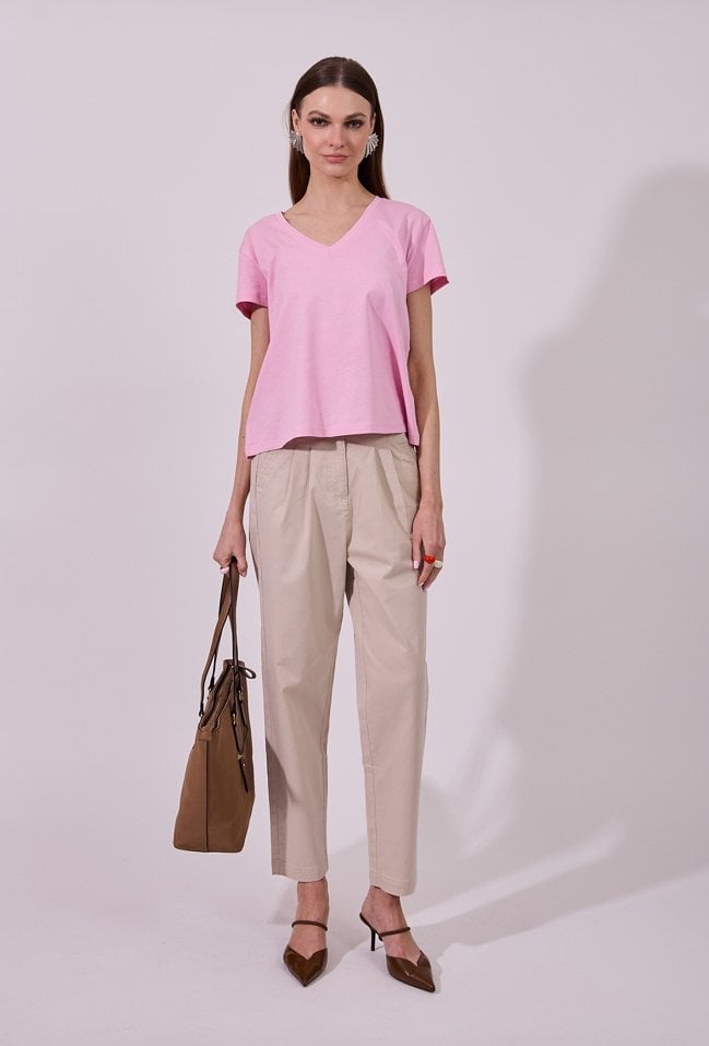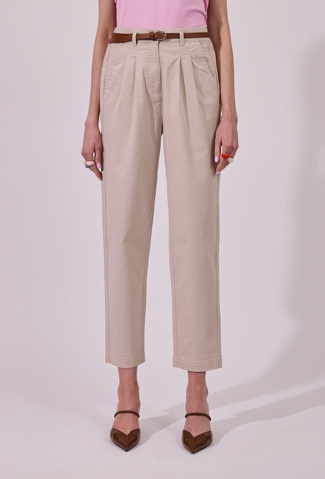 Spodnie damskie o prostym, swobodnym kroju. Model z wysokim stanem oraz zakładkami z przodu, które zapewniają komfort noszenia i eleganckie ułożenie na sylwetce. Klasyczne kieszenie oraz szlufki w pasie umożliwiają stylizację z paskiem, podkreślając talię. Modelka na zdjęciu ma 177 cm wzrostu i prezentuje rozmiar 36.