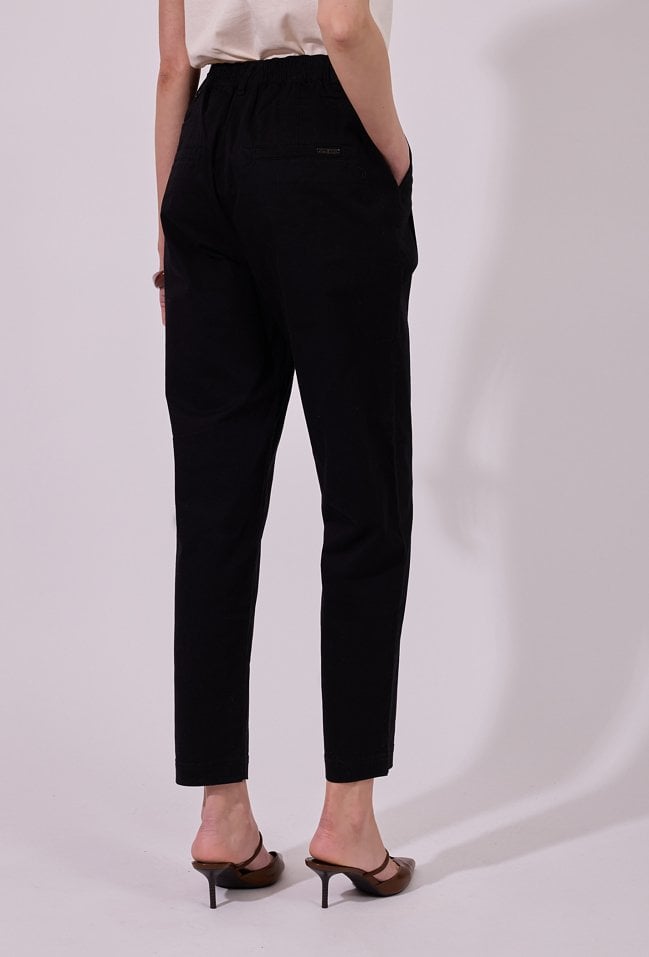 Spodnie damskie o prostym, swobodnym kroju. Model z wysokim stanem oraz zakładkami z przodu, które zapewniają komfort noszenia i eleganckie ułożenie na sylwetce. Klasyczne kieszenie oraz szlufki w pasie umożliwiają stylizację z paskiem, podkreślając talię. Modelka na zdjęciu ma 177 cm wzrostu i prezentuje rozmiar 36.