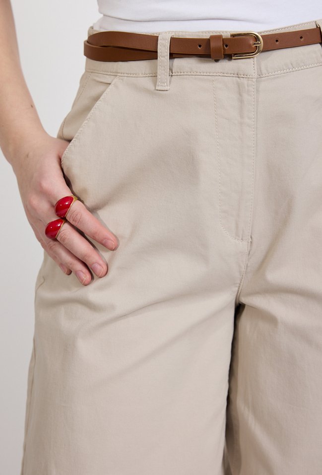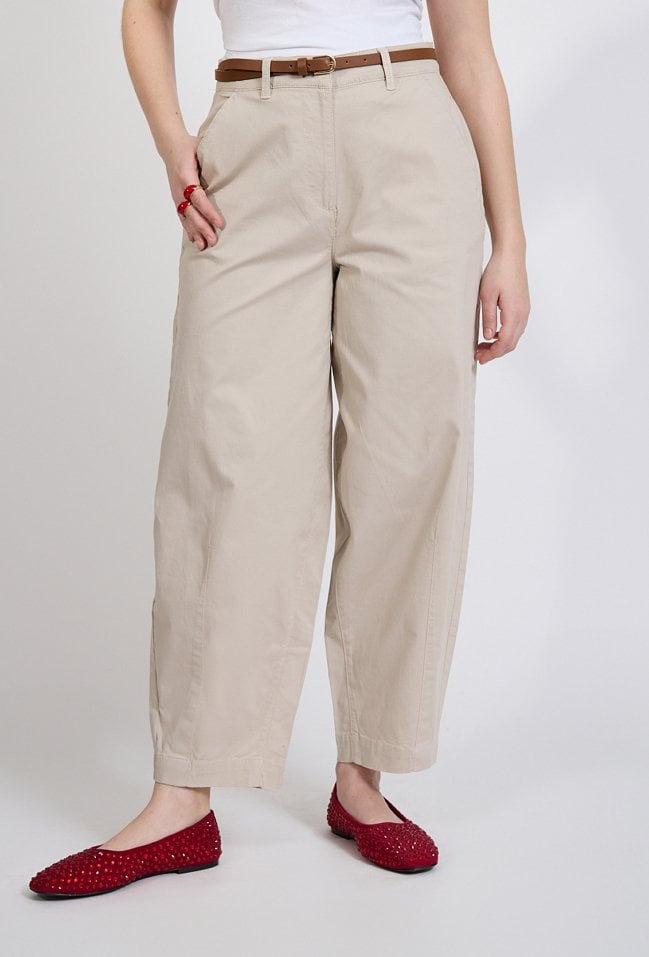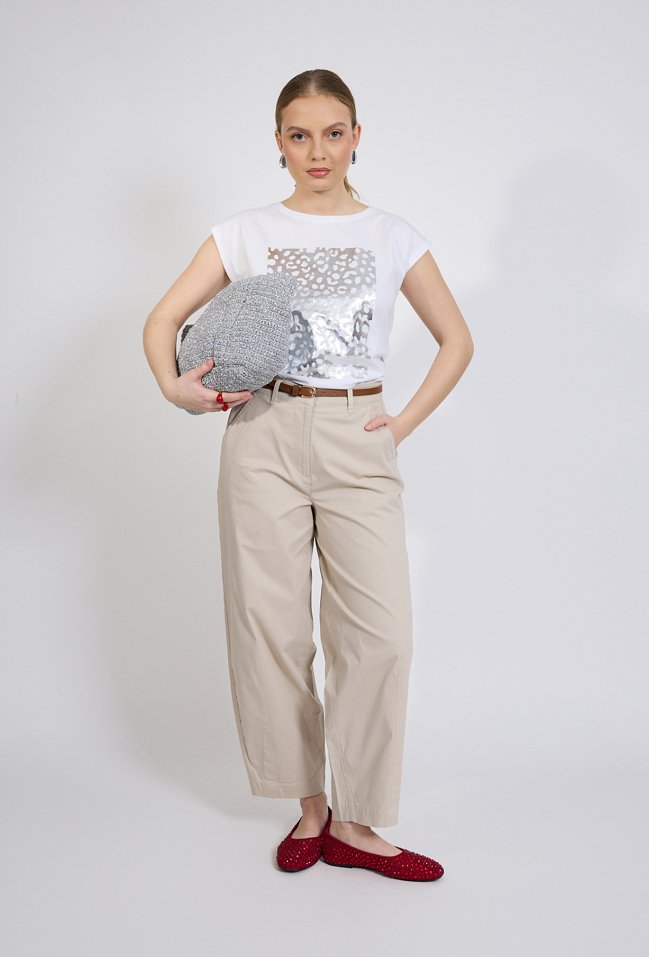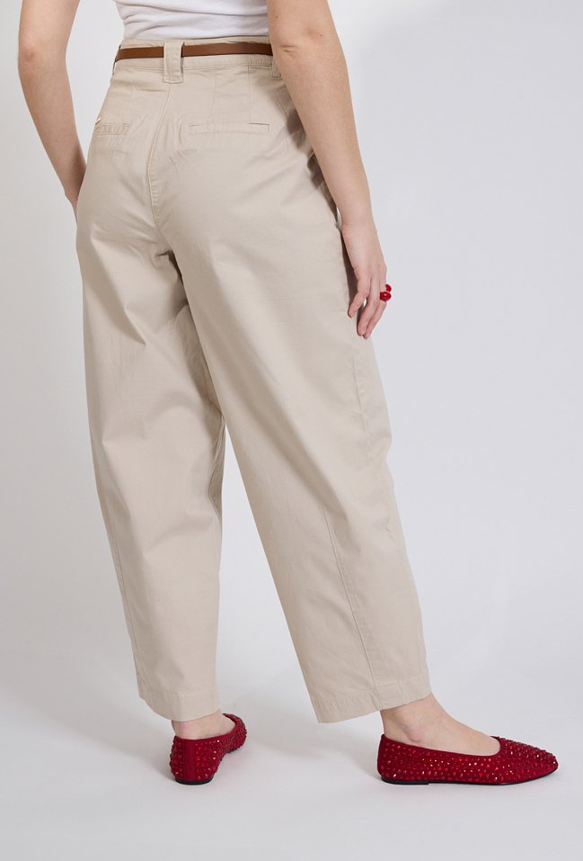 Spodnie damskie o swobodnym, komfortowym kroju. Model z wysokim stanem oraz prostymi nogawkami, które można podwinąć, nadając stylizacji bardziej casualowego charakteru. Po bokach znajdują się praktyczne kieszenie zwiększające funkcjonalność modelu. Modelka na zdjęciu ma 177 cm wzrostu i prezentuje rozmiar 36.