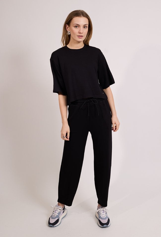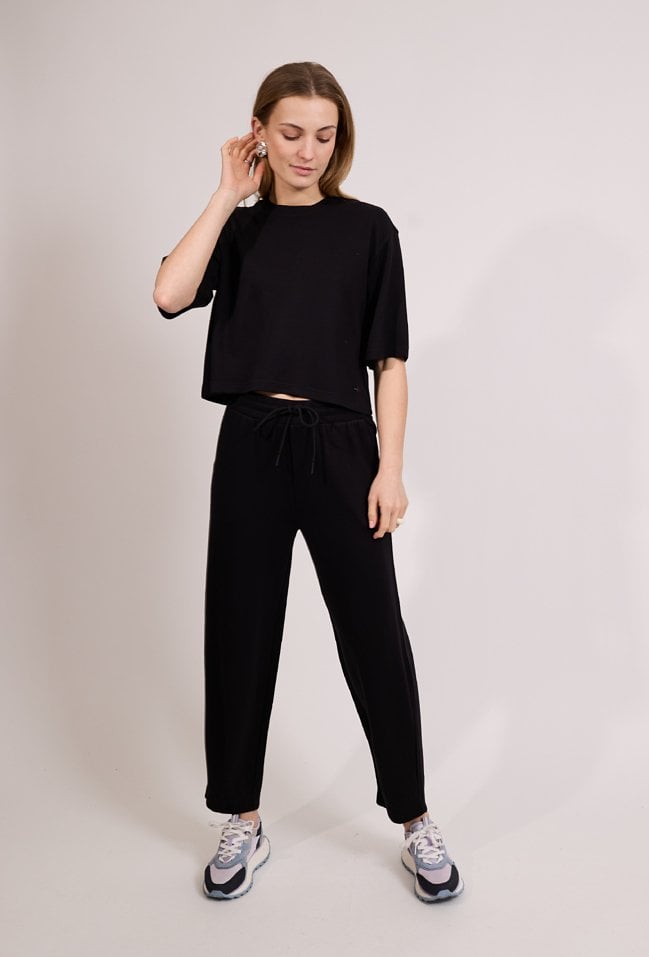 Spodnie damskie o luźnym kroju z prostą nogawką. Model z elastycznym pasem oraz wiązaniem, które zapewnia wygodę i dobre dopasowanie do sylwetki. Spodnie doskonale sprawdzą się w codziennych i casualowych stylizacjach, gwarantując komfort i swobodę ruchów. Modelka na zdjęciu ma 177 cm wzrostu i prezentuje rozmiar S