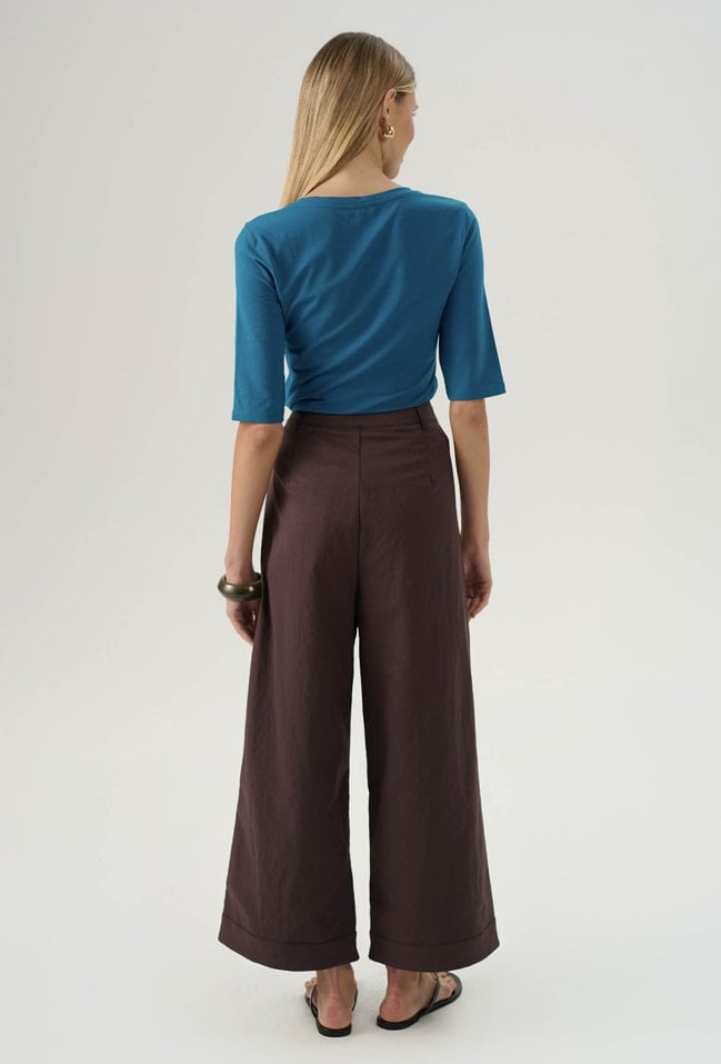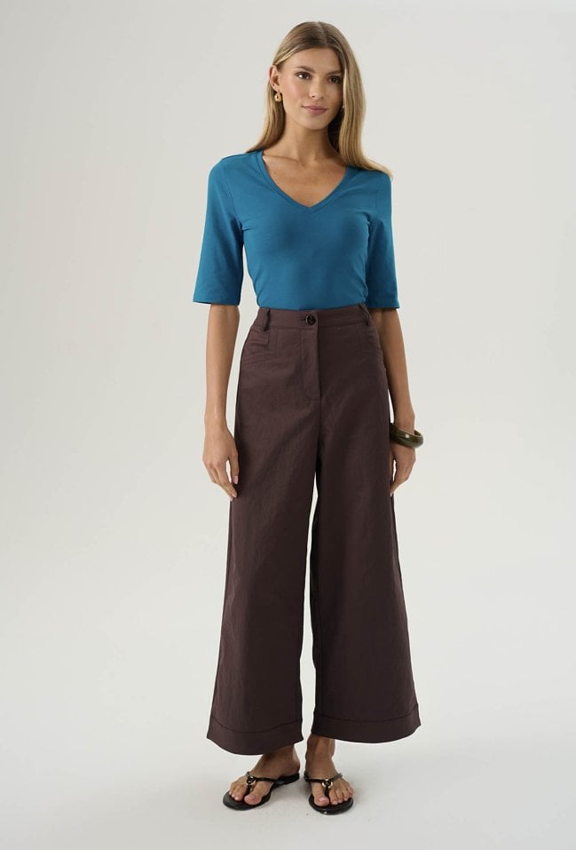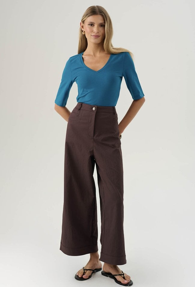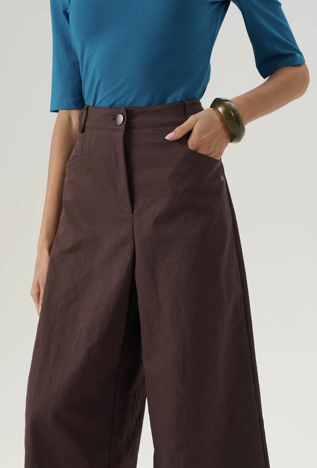 Stylowe spodnie typu culotte to świetna propozycja dla kobiet ceniących wygodę i nowoczesny look. Luźniejszy fason z wysokim stanem pięknie podkreśla sylwetkę, a praktyczne kieszenie na wysokości bioder dodają funkcjonalności. Zapięcie na zamek i szlufki umożliwiają noszenie z ulubionym paskiem. Idealne do pracy, na spacer czy spotkanie w mieście. Modelka na zdjęciu ma 177 cm wzrostu i prezentuje rozmiar 36.