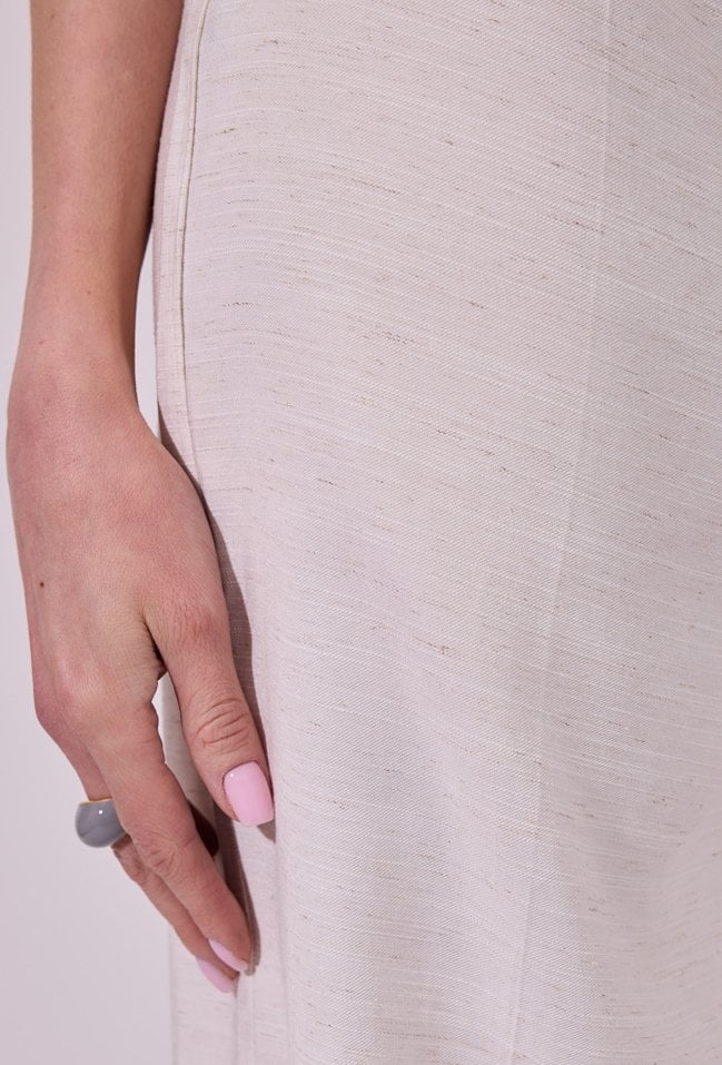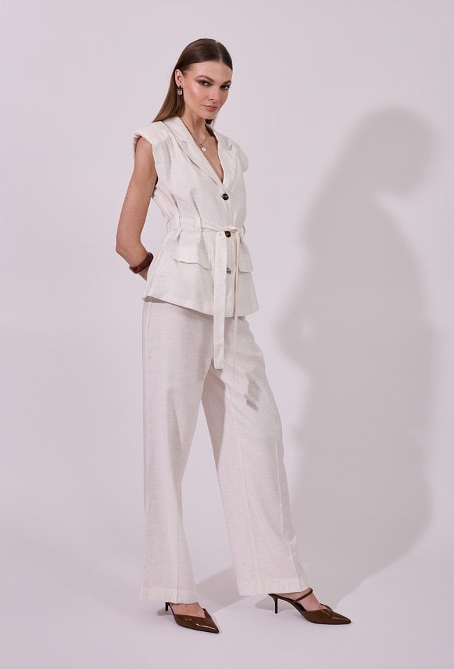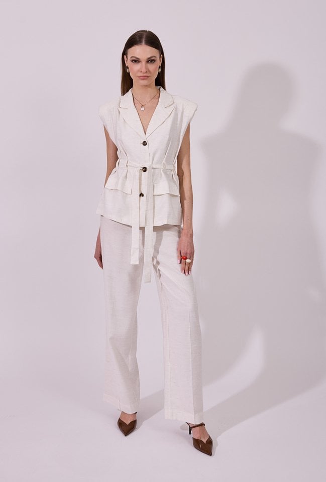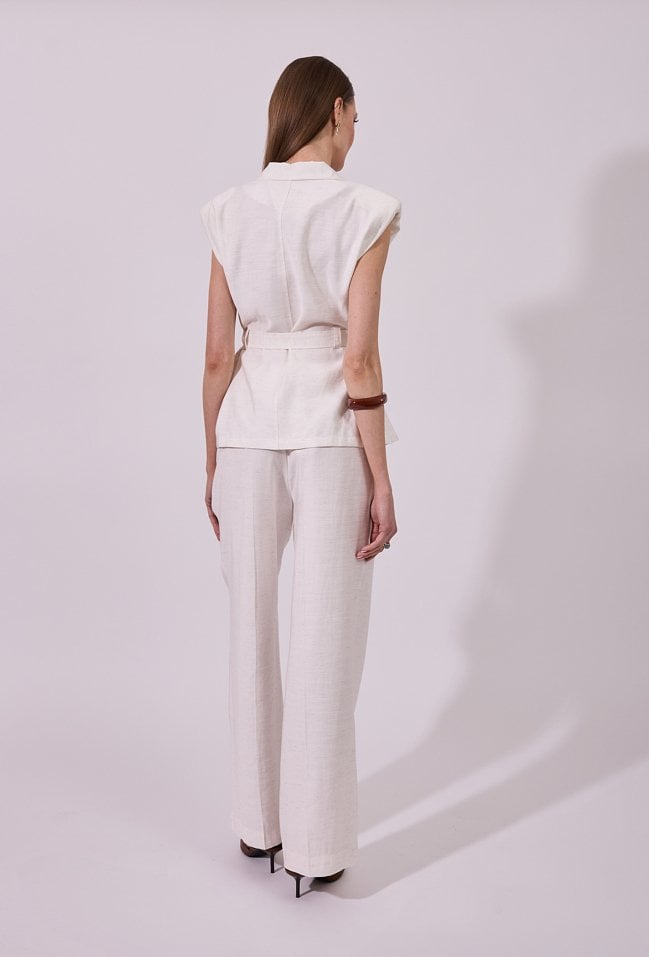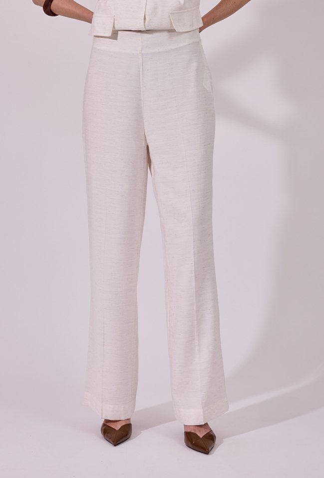 Spodnie damskie o eleganckim, lekko rozszerzanym kroju. Model z wysokim stanem, który podkreśla talię i optycznie wydłuża sylwetkę. Prosta linia z delikatnym kantem nadaje całości klasycznego charakteru, a lekko rozszerzana nogawka dodaje nowoczesnej elegancji. Modelka na zdjęciu ma 177 cm wzrostu i prezentuje rozmiar 36.