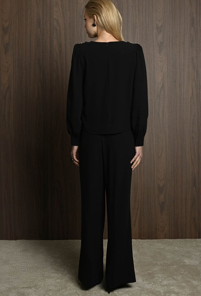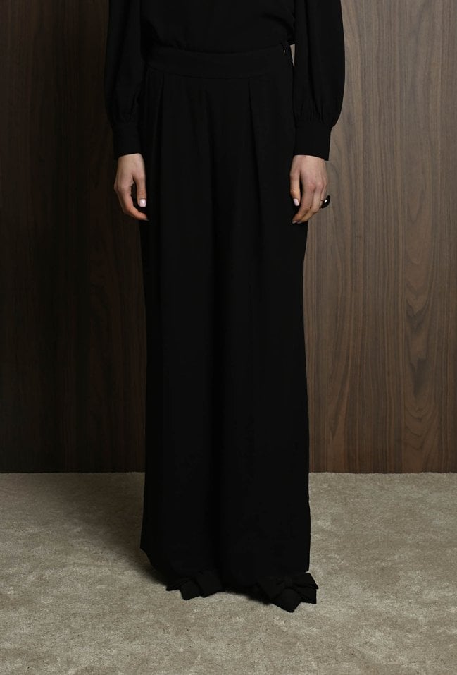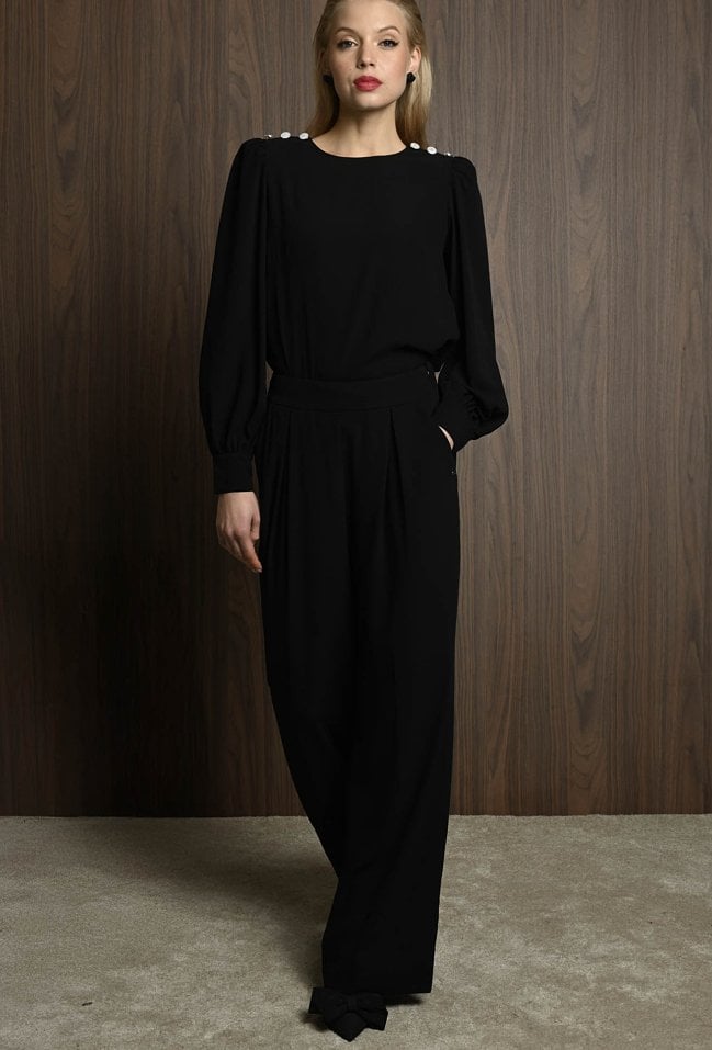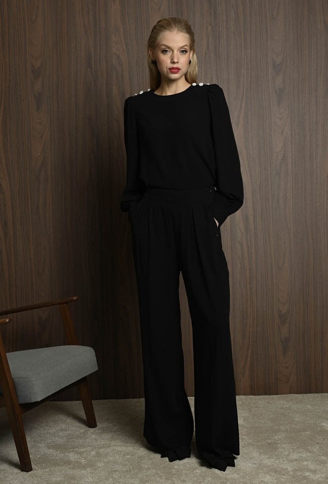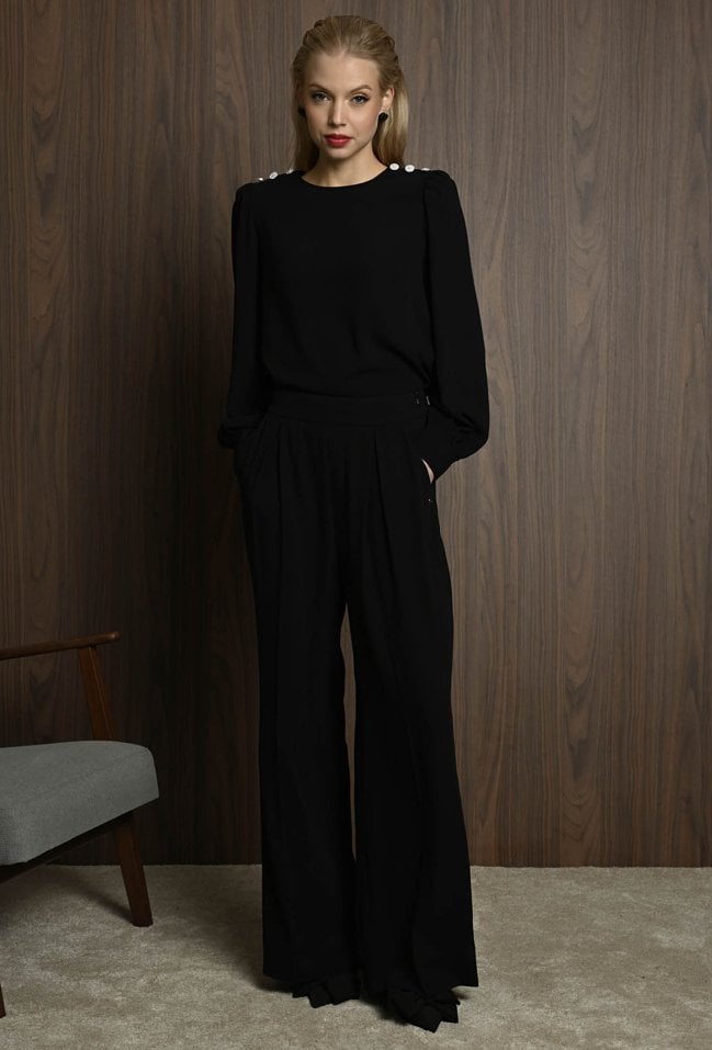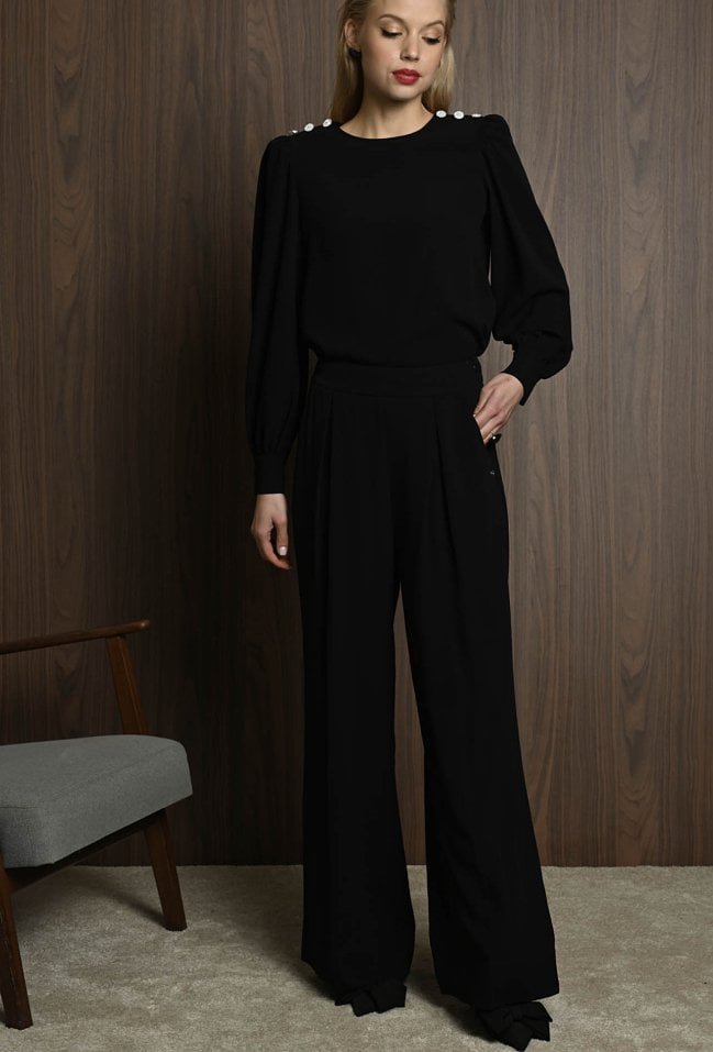 Eleganckie spodnie z szeroką nogawką to doskonały wybór dla miłośniczek ponadczasowego stylu z nutą nowoczesnej elegancji. Wysoki stan pięknie podkreśla talię, a szerokie, lekko wydłużone nogawki optycznie wysmuklają sylwetkę. Dwie zaszewki z przodu dodają całości elegancji i wyrafinowanego charakteru. spodnie występuję w komplecie z bluzką. Modelka na zdjęciu ma 177 cm wzrostu i prezentuje rozmiar 36.